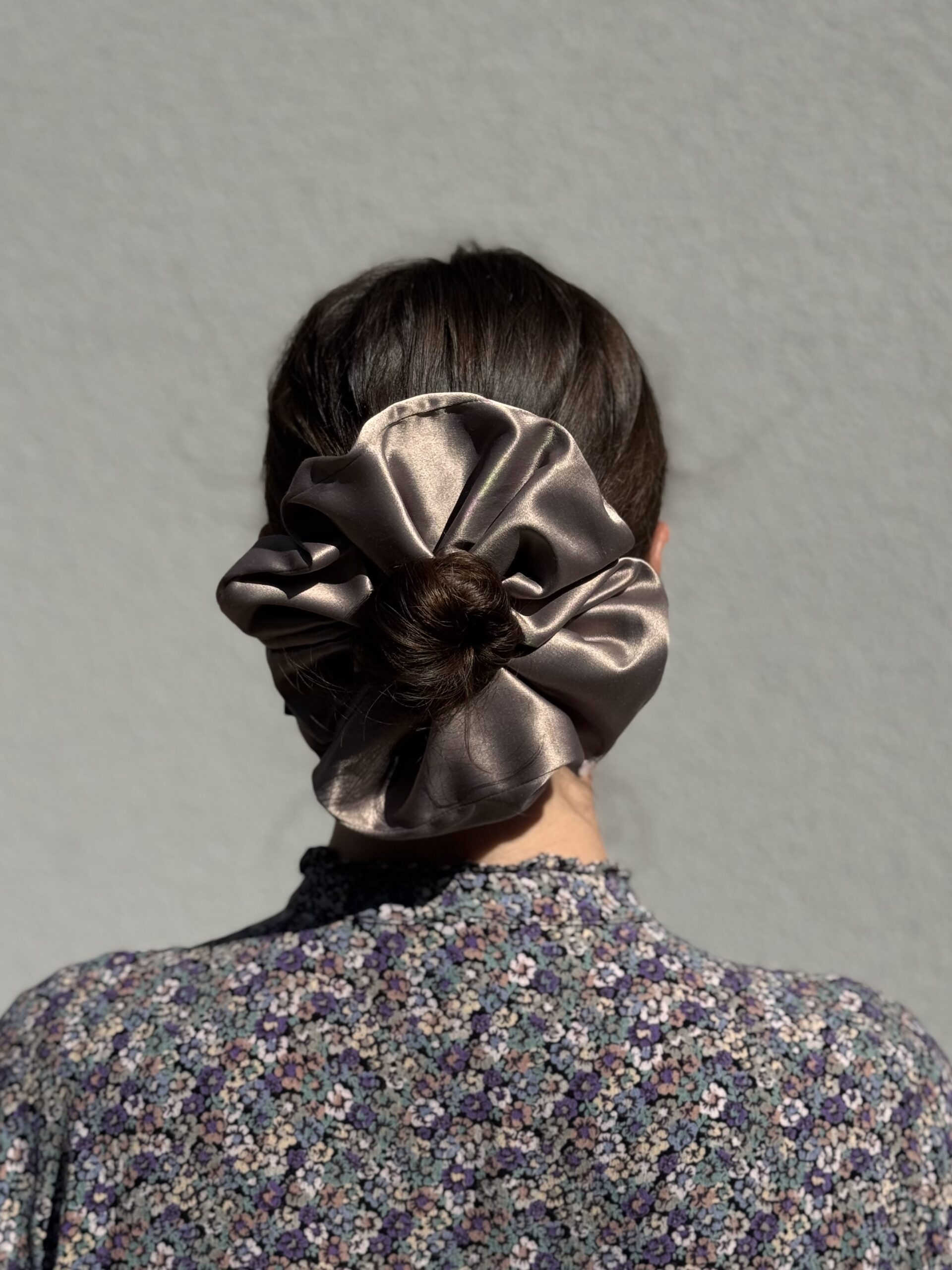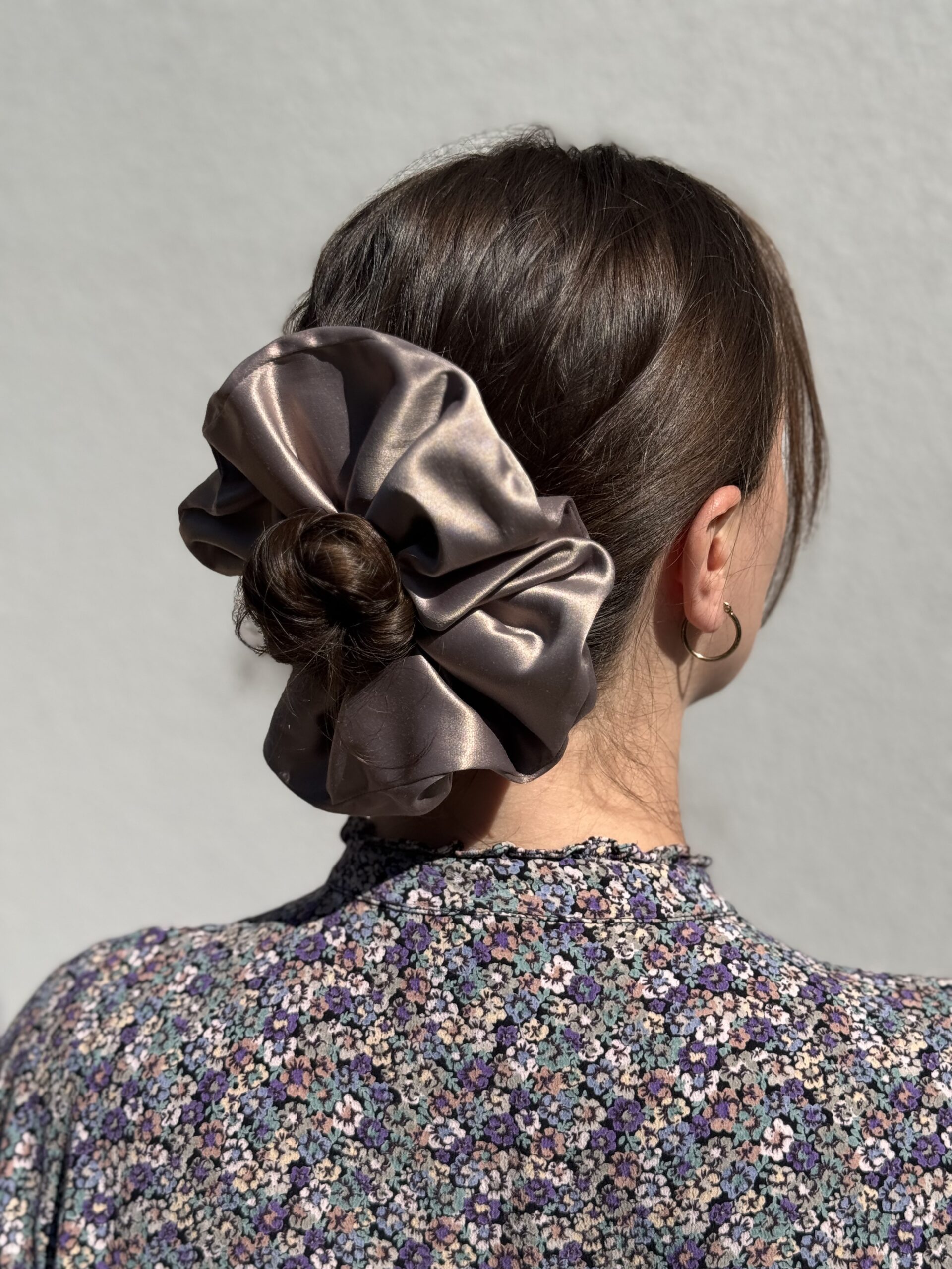Duża scrunchie uszyta z satyny bawełnianej w odcieniu chłodnego karmelu.