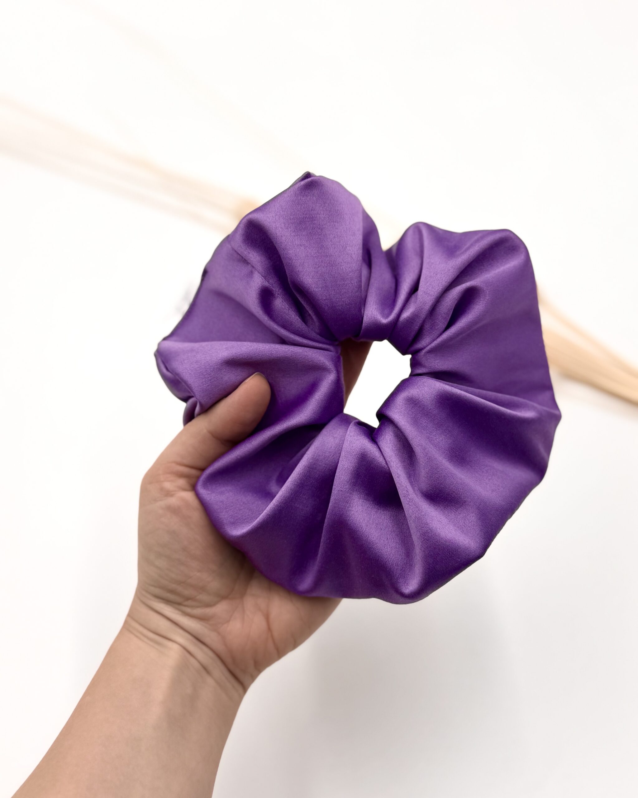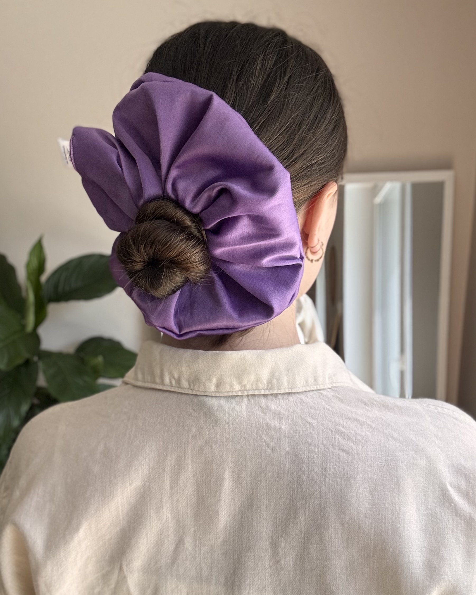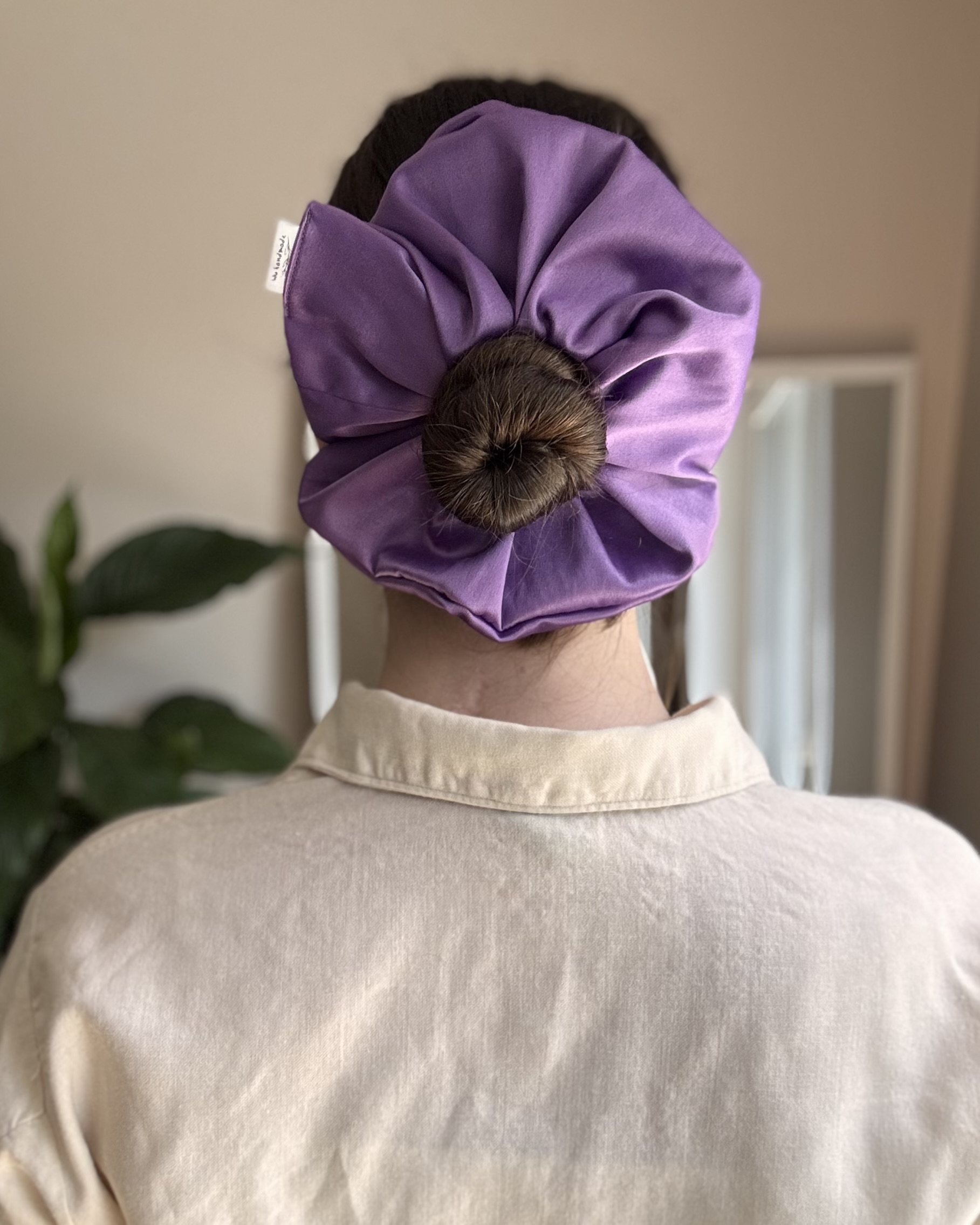 Big Scrunchie uszyta z wysokiej jakości satyny bawełnianej w kolorze fioletowym.