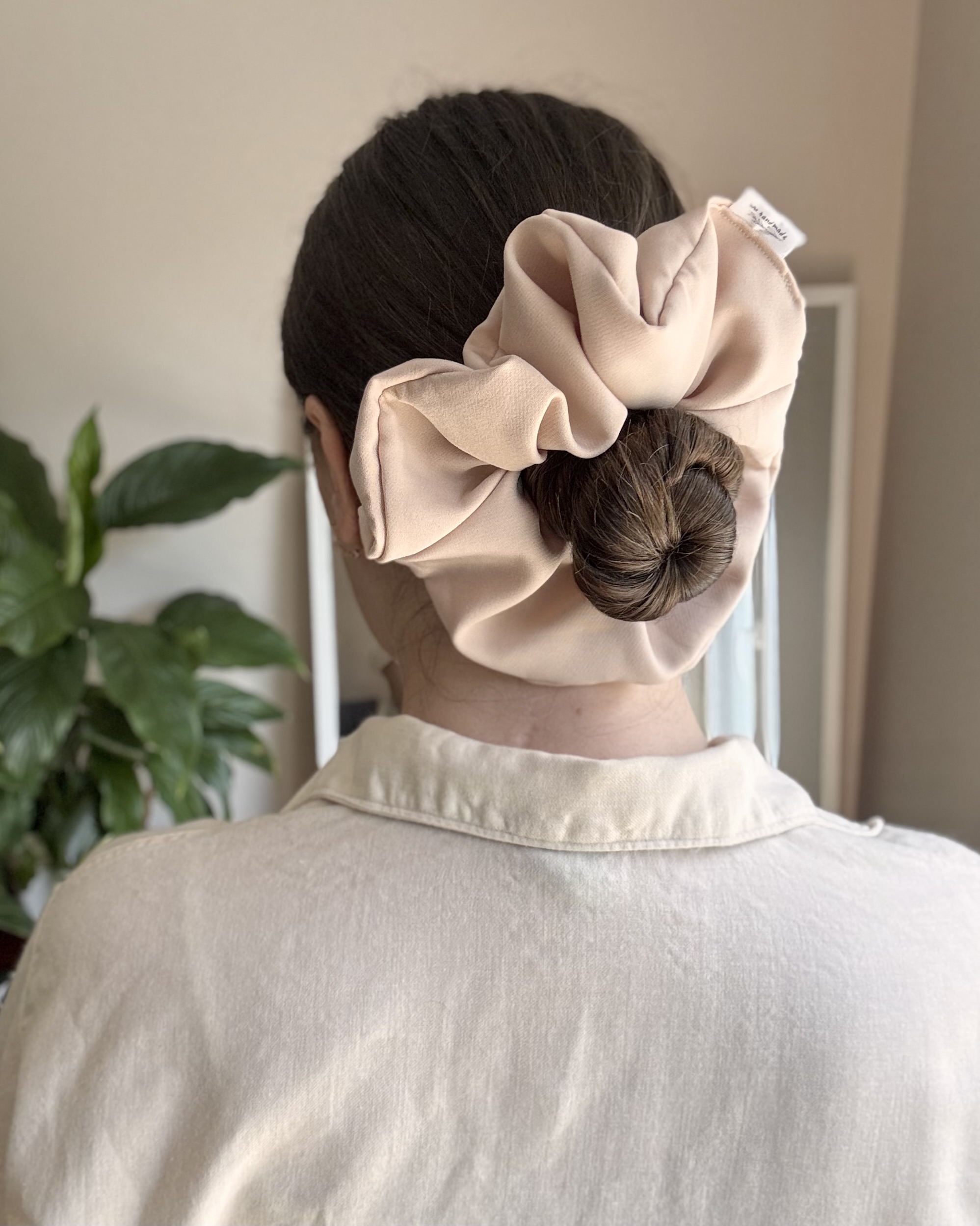 Duża scrunchie uszyta z grubej tkaniny w kolorze jasnobeżowym.