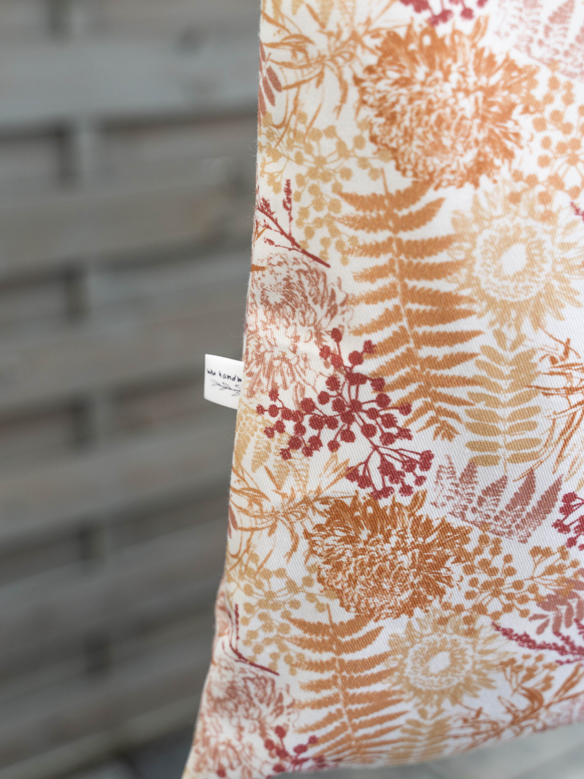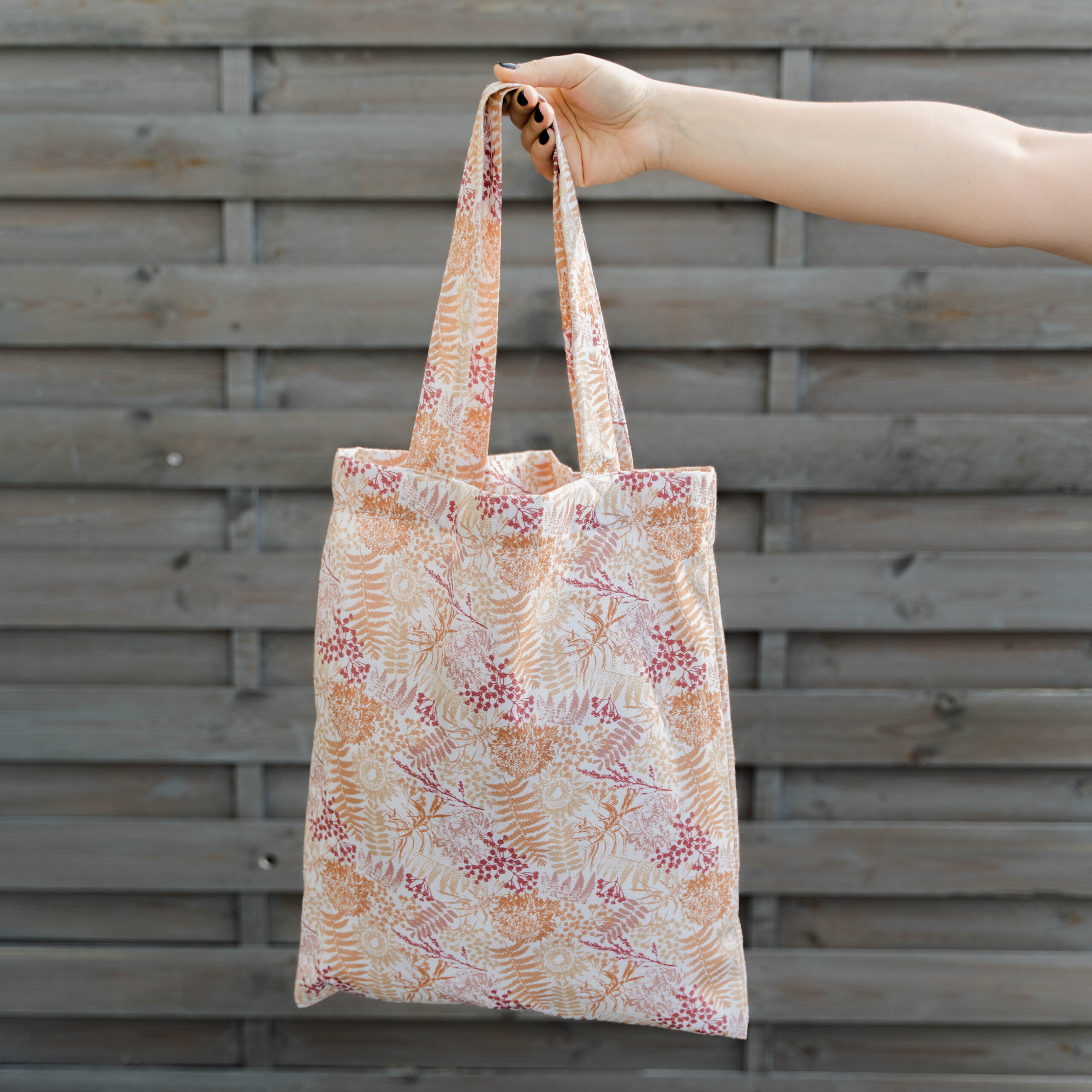 Eko torba uszyta z delikatnego drelichu bawełnianego w jasnych kolorach. Wzór roślinny, w paprocie.