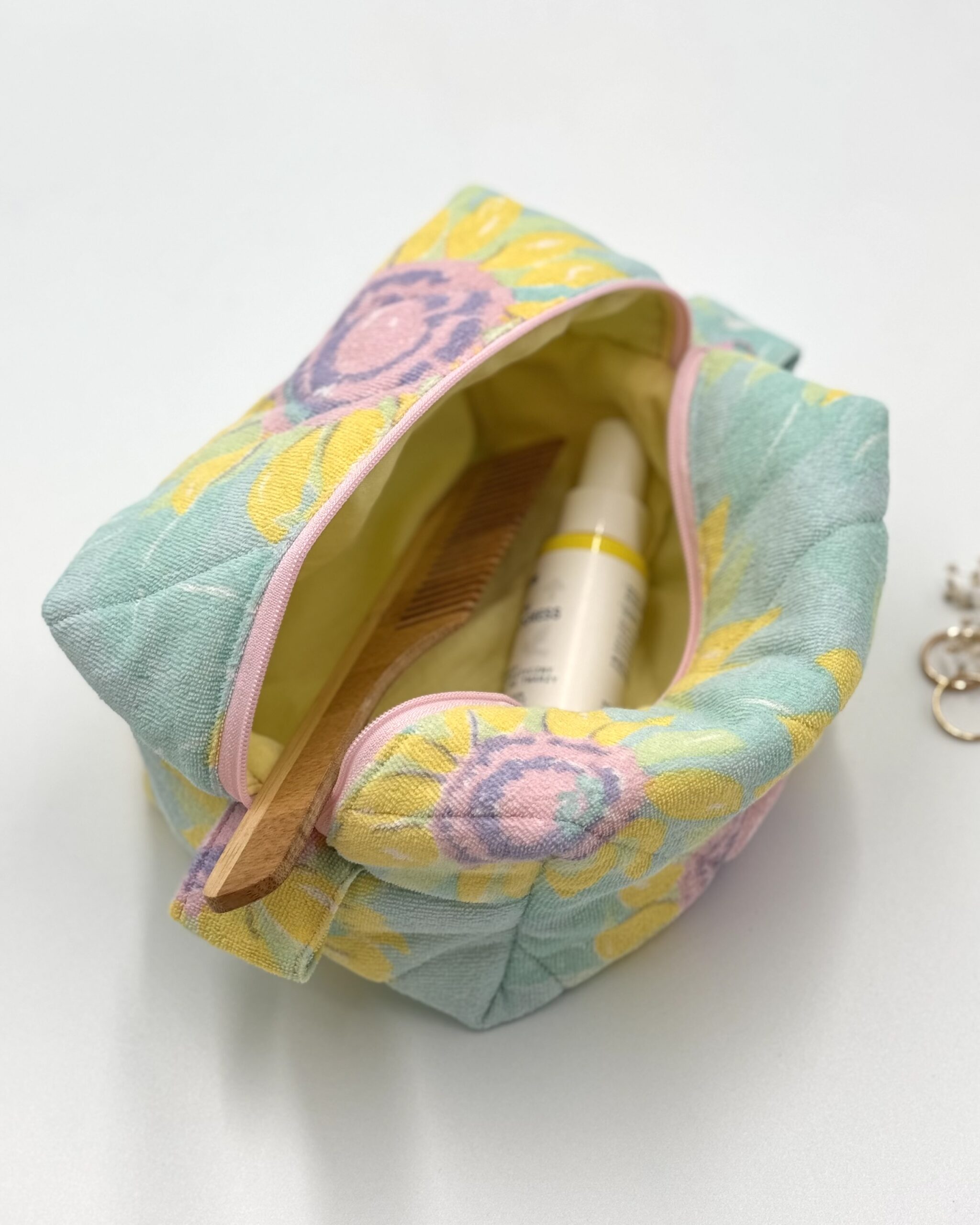 Pikowana cienką warstwą włókniny, dzięki czemu zachowuje kształt, a jednocześnie pozostaje lekka i miękka w dotyku. Pojemna, idealna do przechowywania kosmetyków, akcesoriów lub drobiazgów w podróży i na co dzień. W środku estetycznie wykończona bawełnianą podszewką.