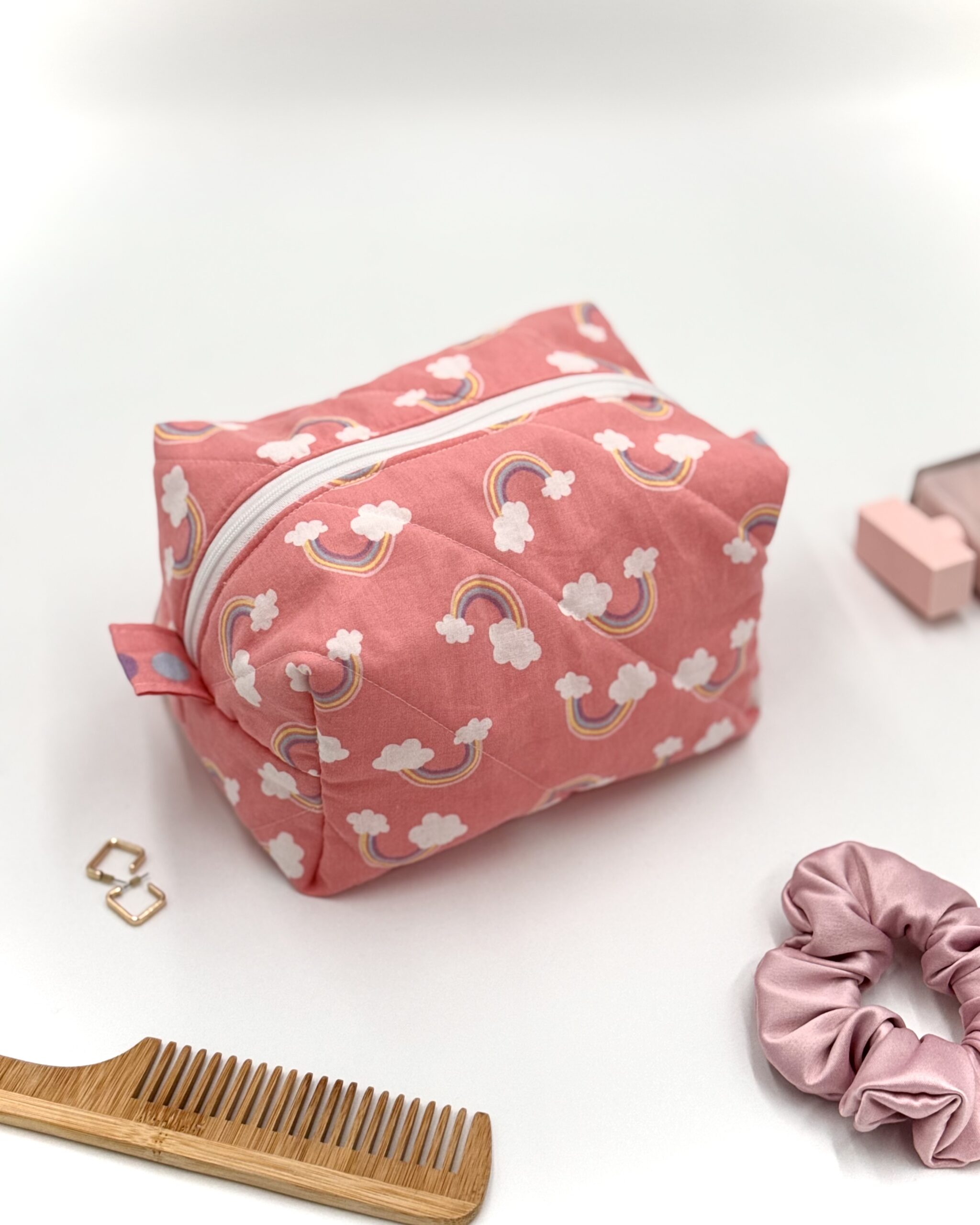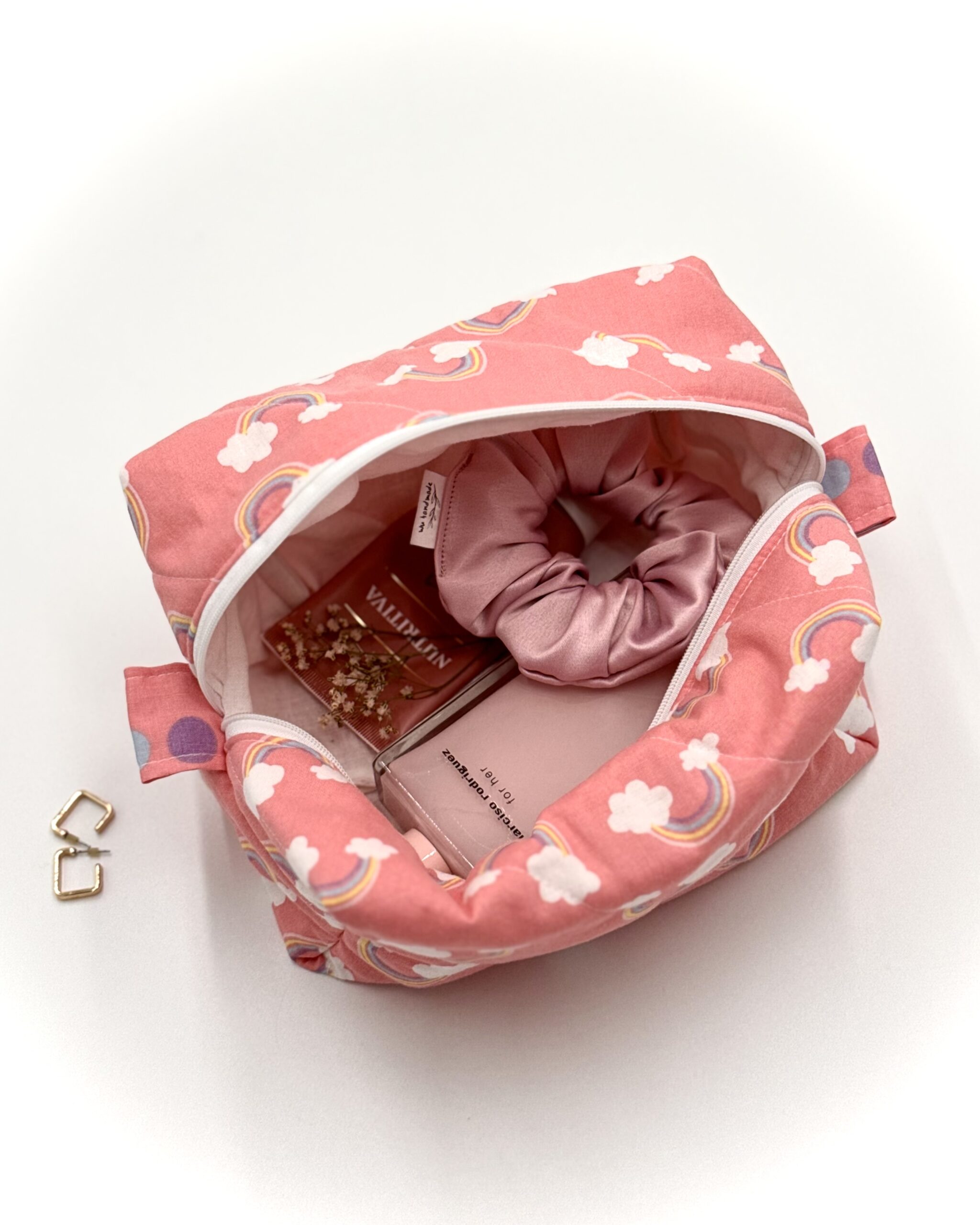 Pikowana cienką warstwą włókniny, dzięki czemu zachowuje kształt, a jednocześnie pozostaje lekka i miękka w dotyku. Pojemna, idealna do przechowywania kosmetyków, akcesoriów lub drobiazgów w podróży i na co dzień.