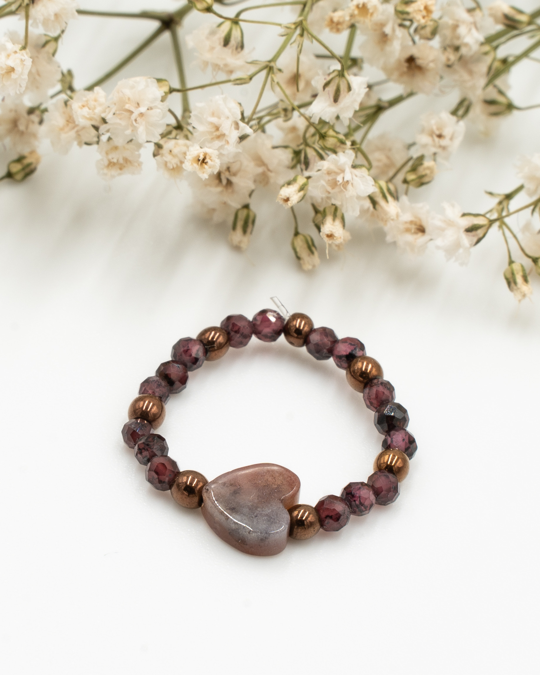 Elastyczny pierścionek wykonany ręcznie z kamieni naturalnych: granat, hematyt, agat indyjski.