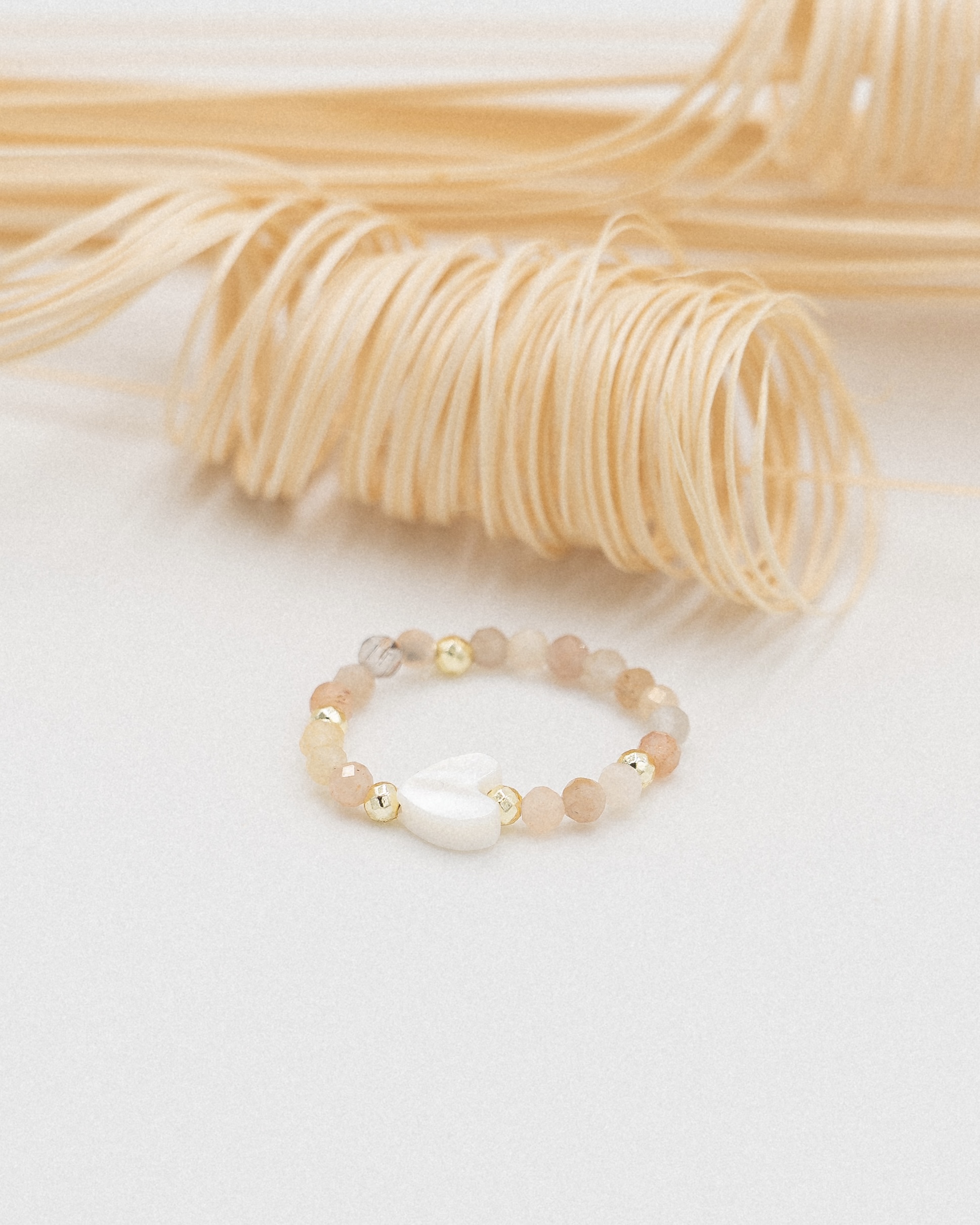 Elastyczny pierścionek wykonany ręcznie z kamieni naturalnych: kamień słoneczny, hematyt, masa perłowa.