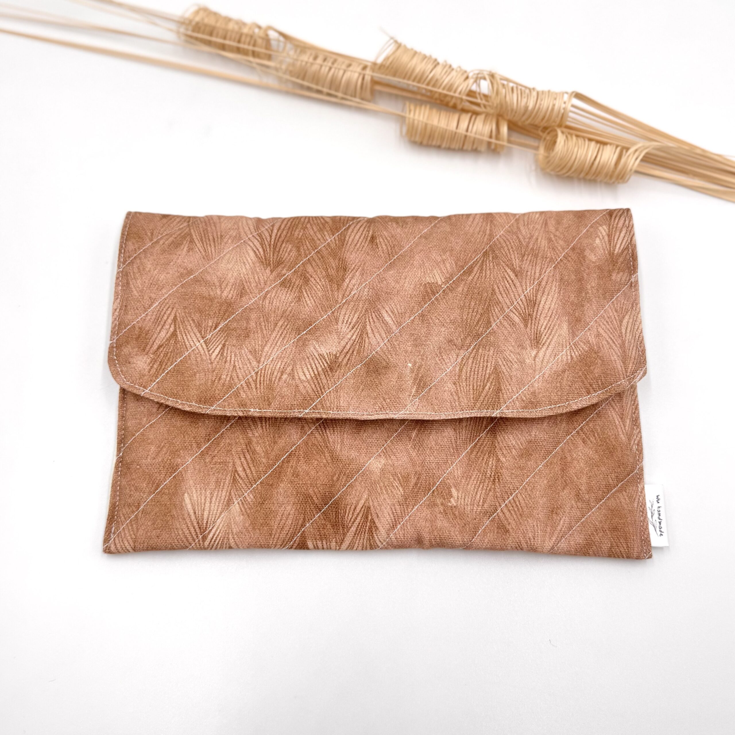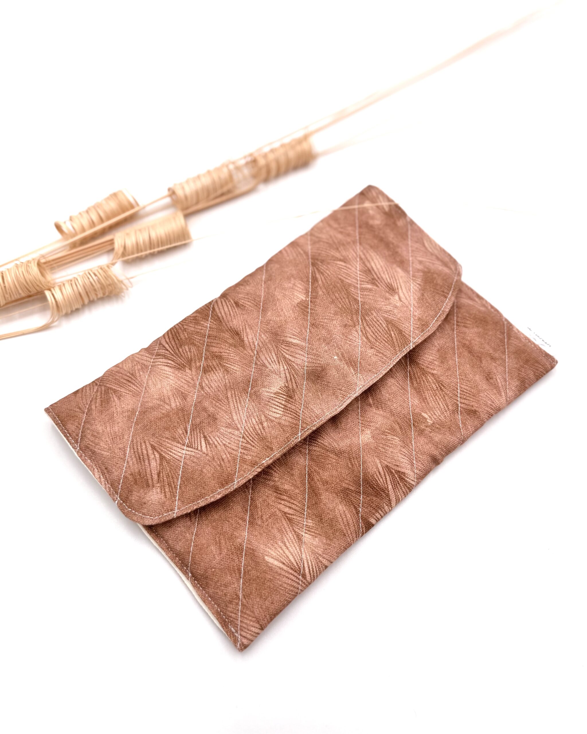 Saszetka, etui na czytnik książek, drobiazgi, kosmetyki. Uszyta z drelichu o delikatnym wzorze warkoczy, z beżową bawełnianą podszewką. W środku wzmocniona dodatkową warstwą włókniny.