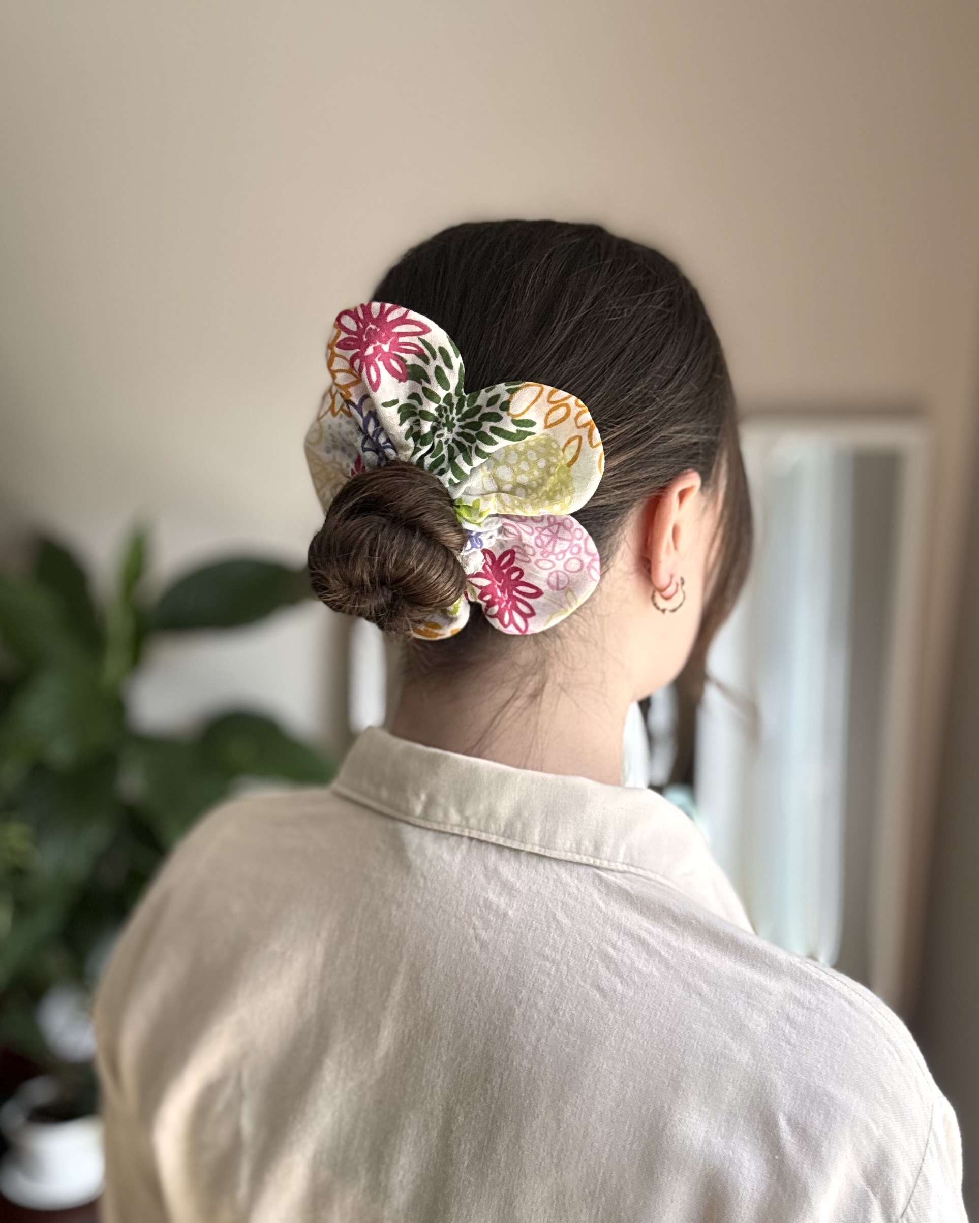 Scrunchie w kształcie kwiatuszka, uszyta z tkaniny o kwiatowym wzorze, to wyjątkowa i wyrazista ozdoba do włosów. Jej delikatna, kwiatowa forma dodaje uroku każdej fryzurze, sprawiając, że pasuje zarówno do codziennych stylizacji, jak i bardziej eleganckich okazji.
