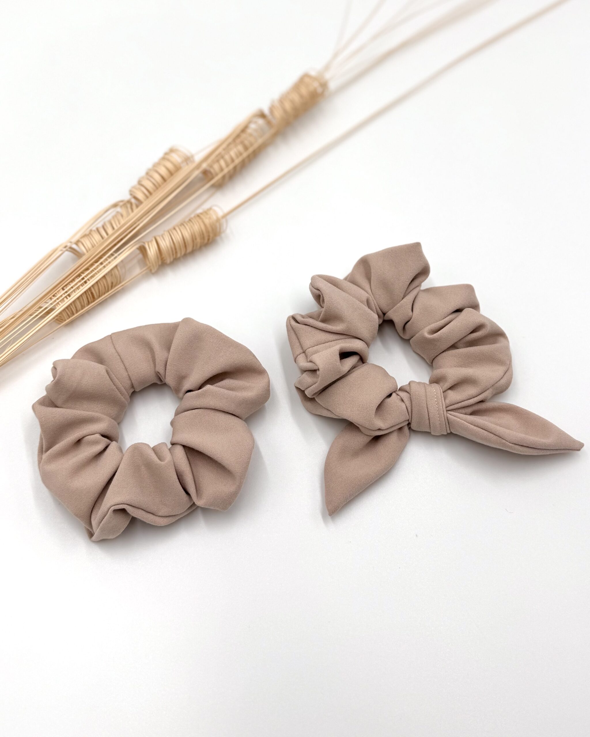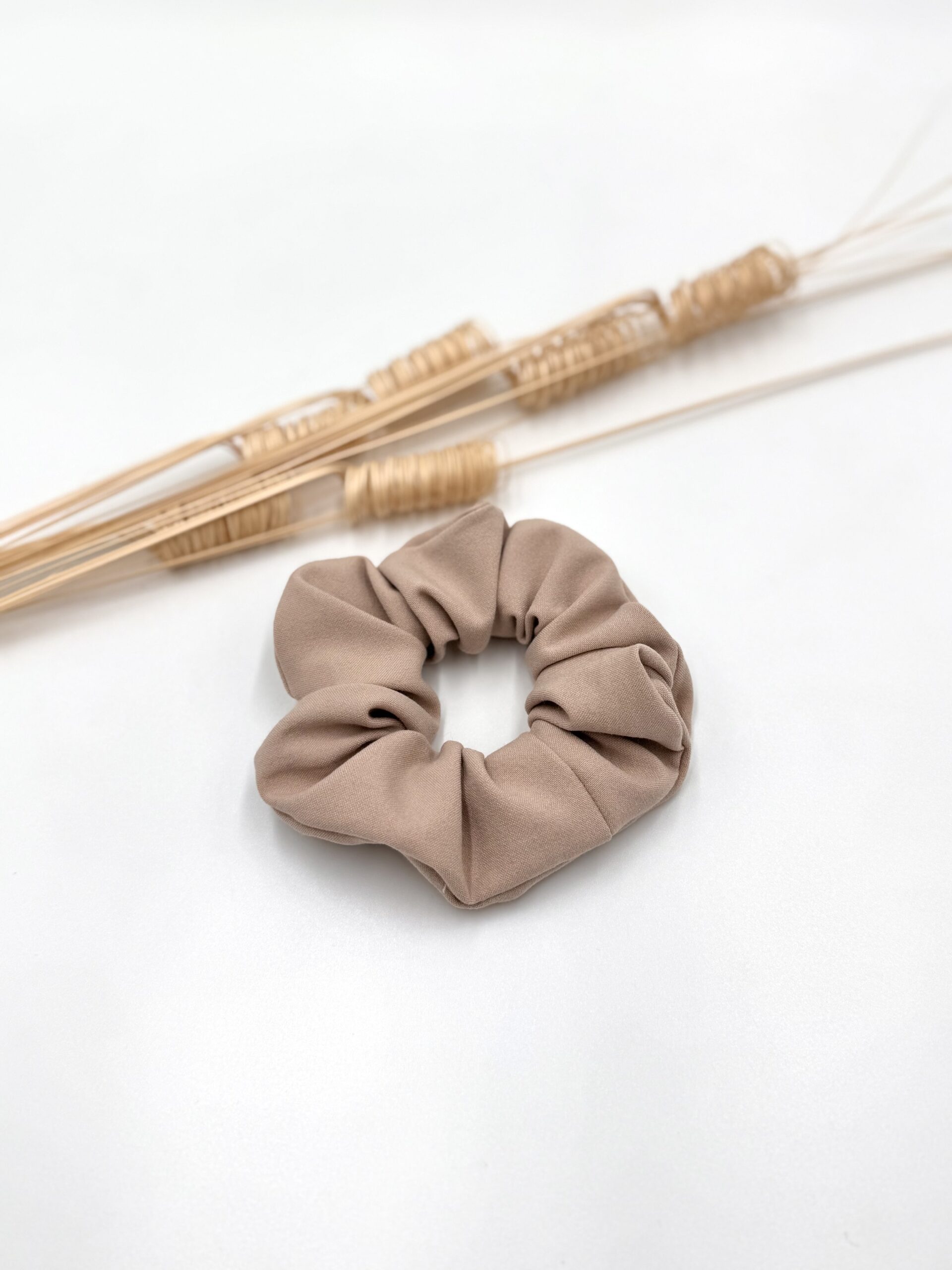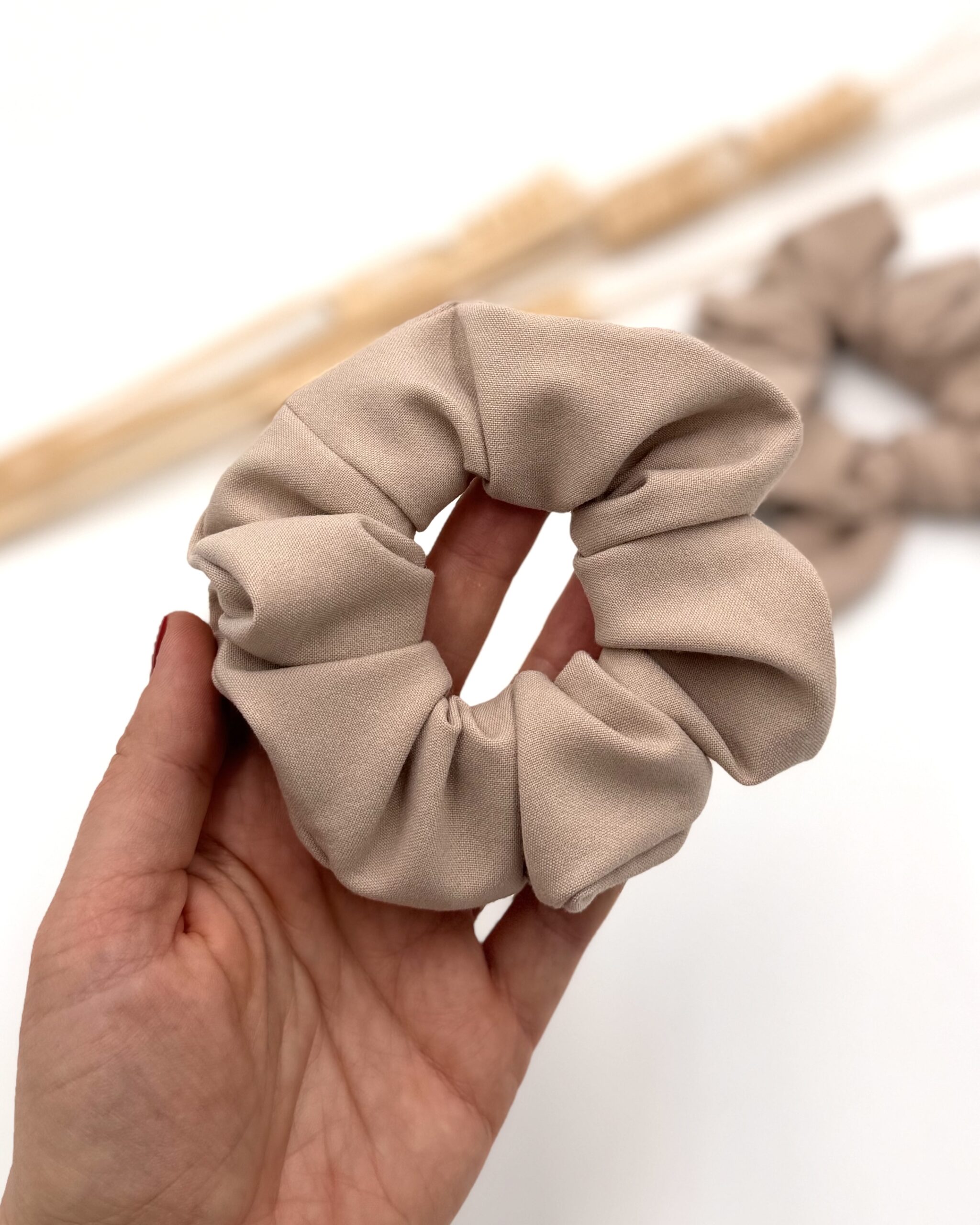 Scrunchie uszyta z mieciutkiej tkaniny w kolorze beżowym.