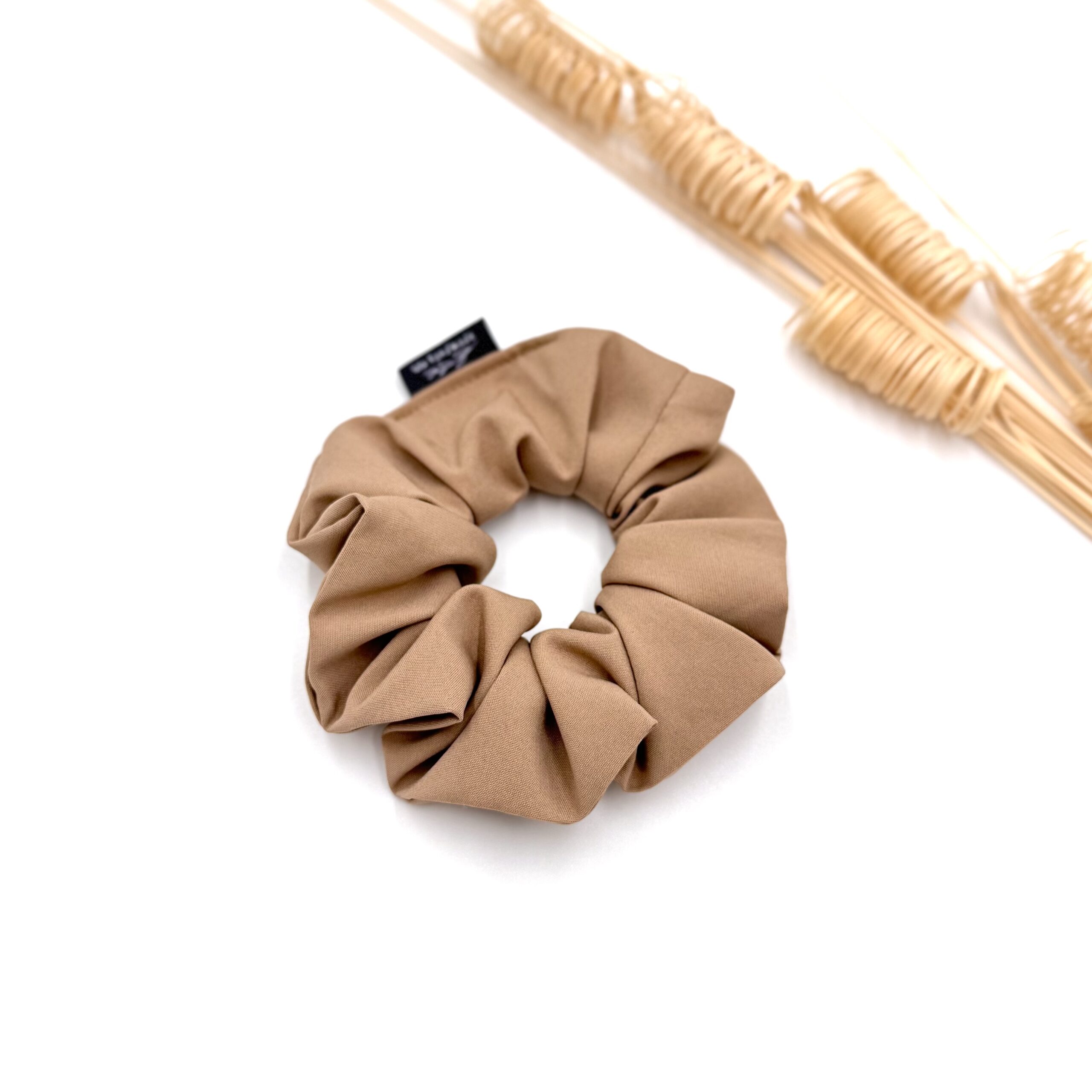 Scrunchie uszyta z delikatnej tkaniny w kolorze beżowym.