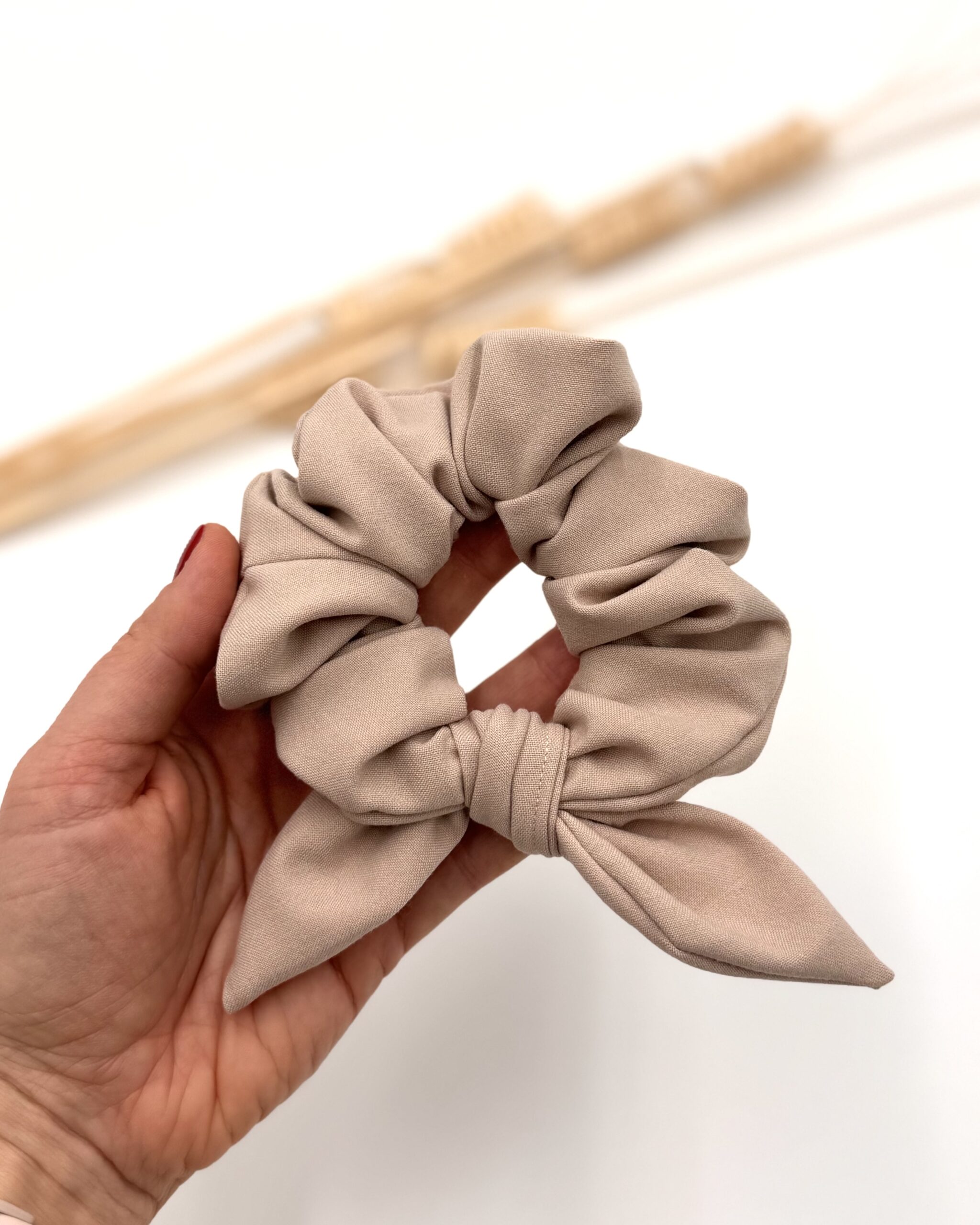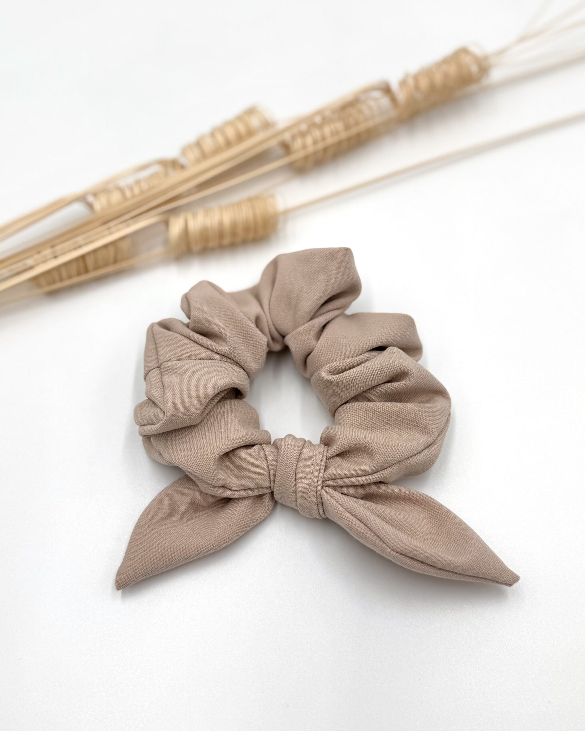 Scrunchie z ogonkami tworzącymi kokardkę. Uszyta z miękkiej tkaniny w kolorze beżowym. Materiał jest gruby i wytrzymały, a jednocześnie bardzo delikatny dla naszych włosów.