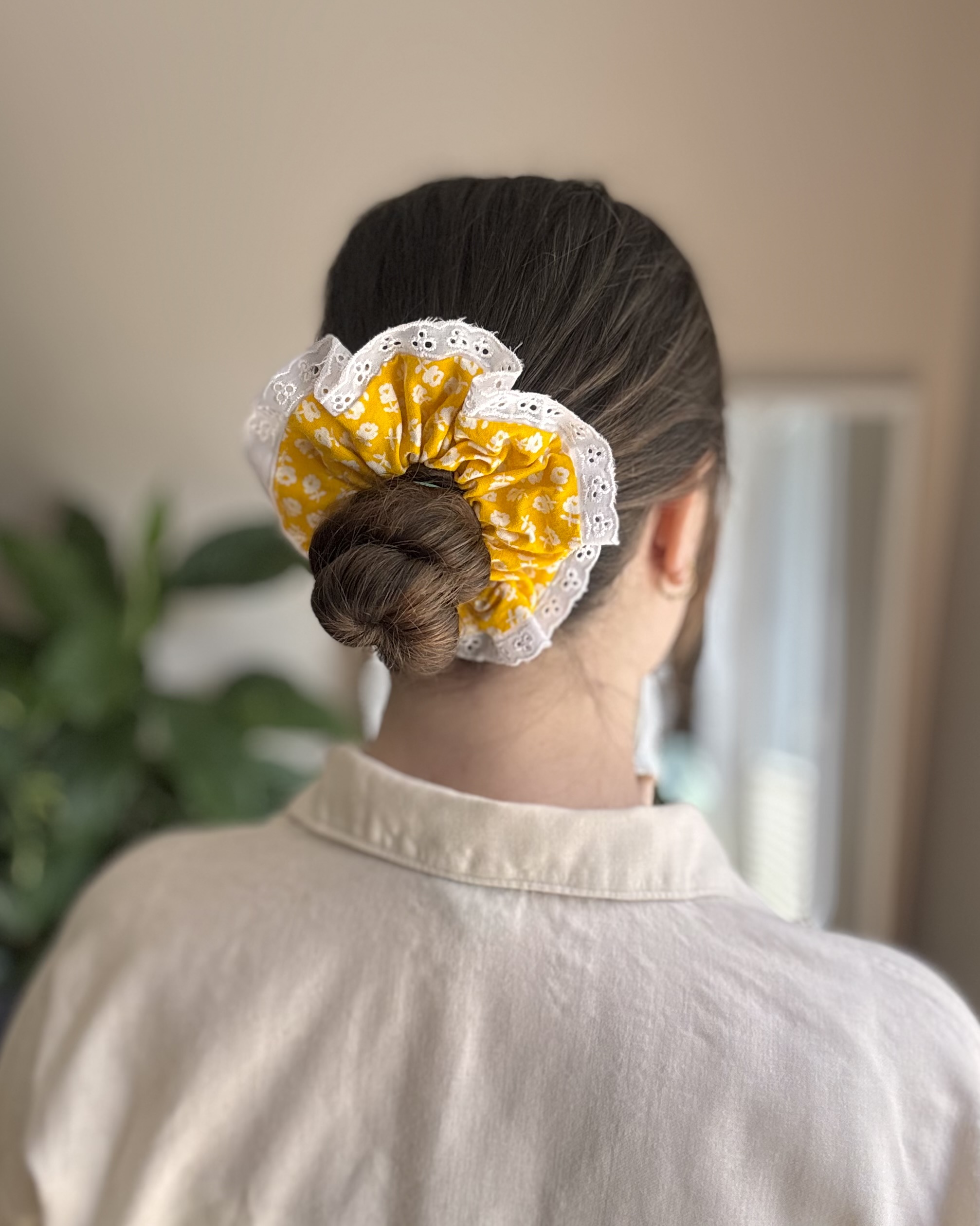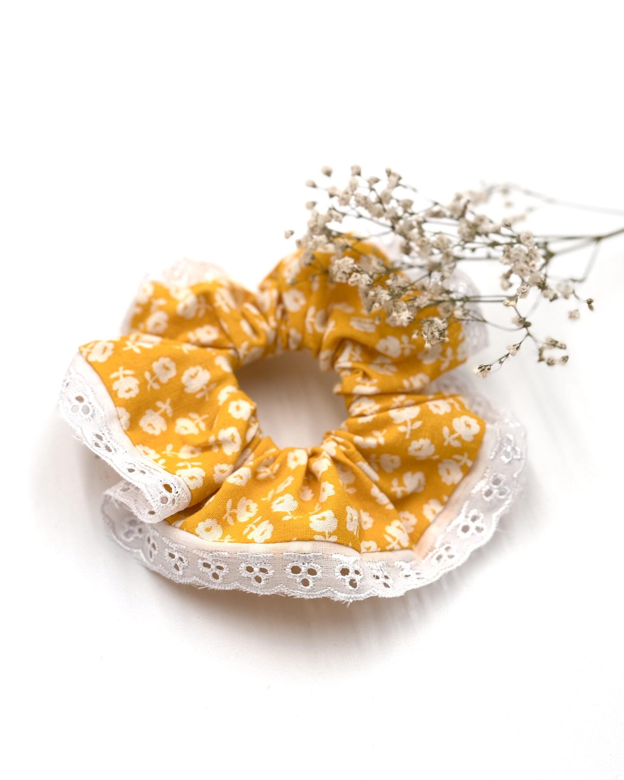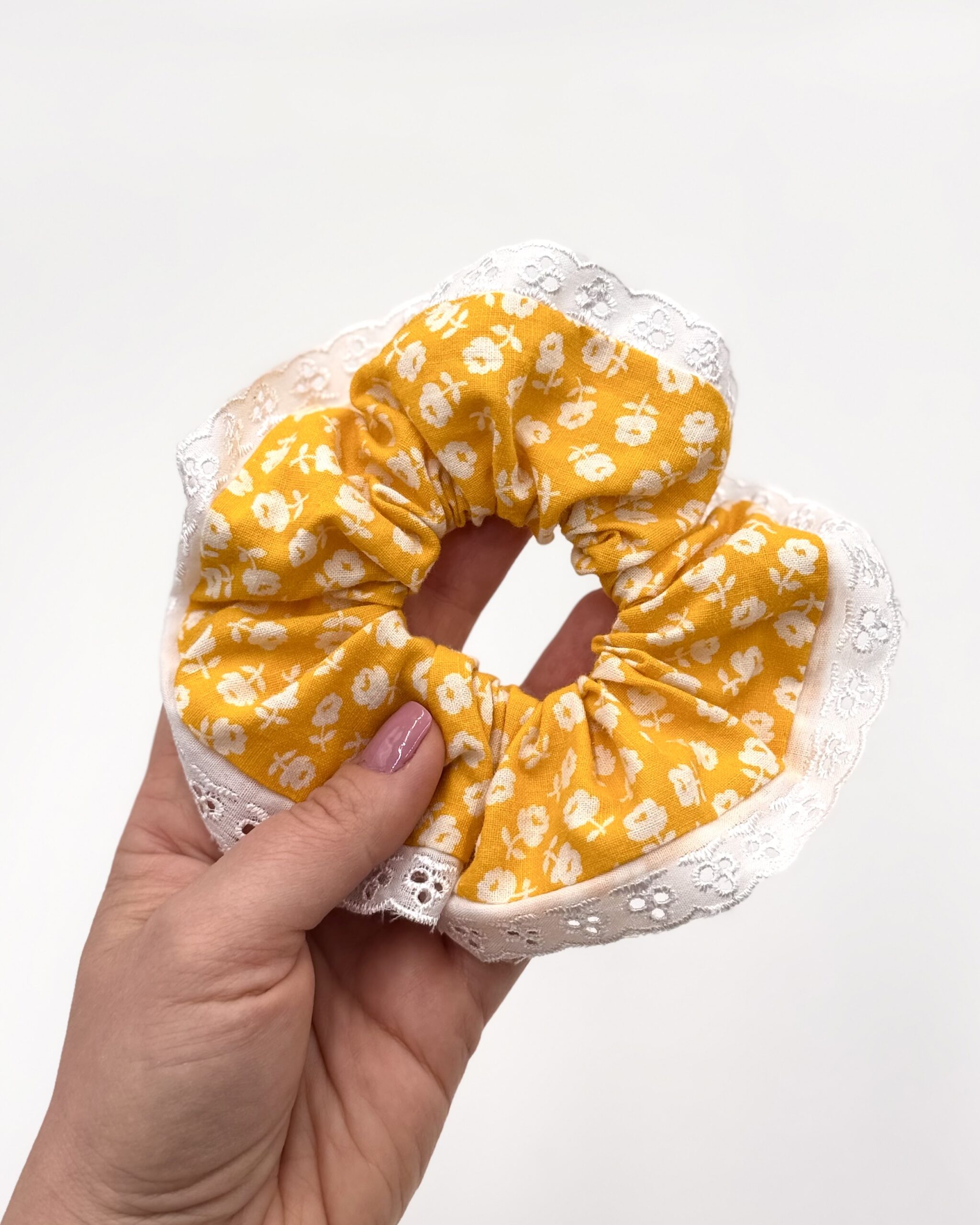 Ta wyjątkowa gumka do włosów łączy kolorowy, żywy wzór w kwiaty z delikatnym brzegiem wykończonym haftem angielskim. To idealny dodatek dla osób, które cenią elegancję w codziennych stylizacjach.