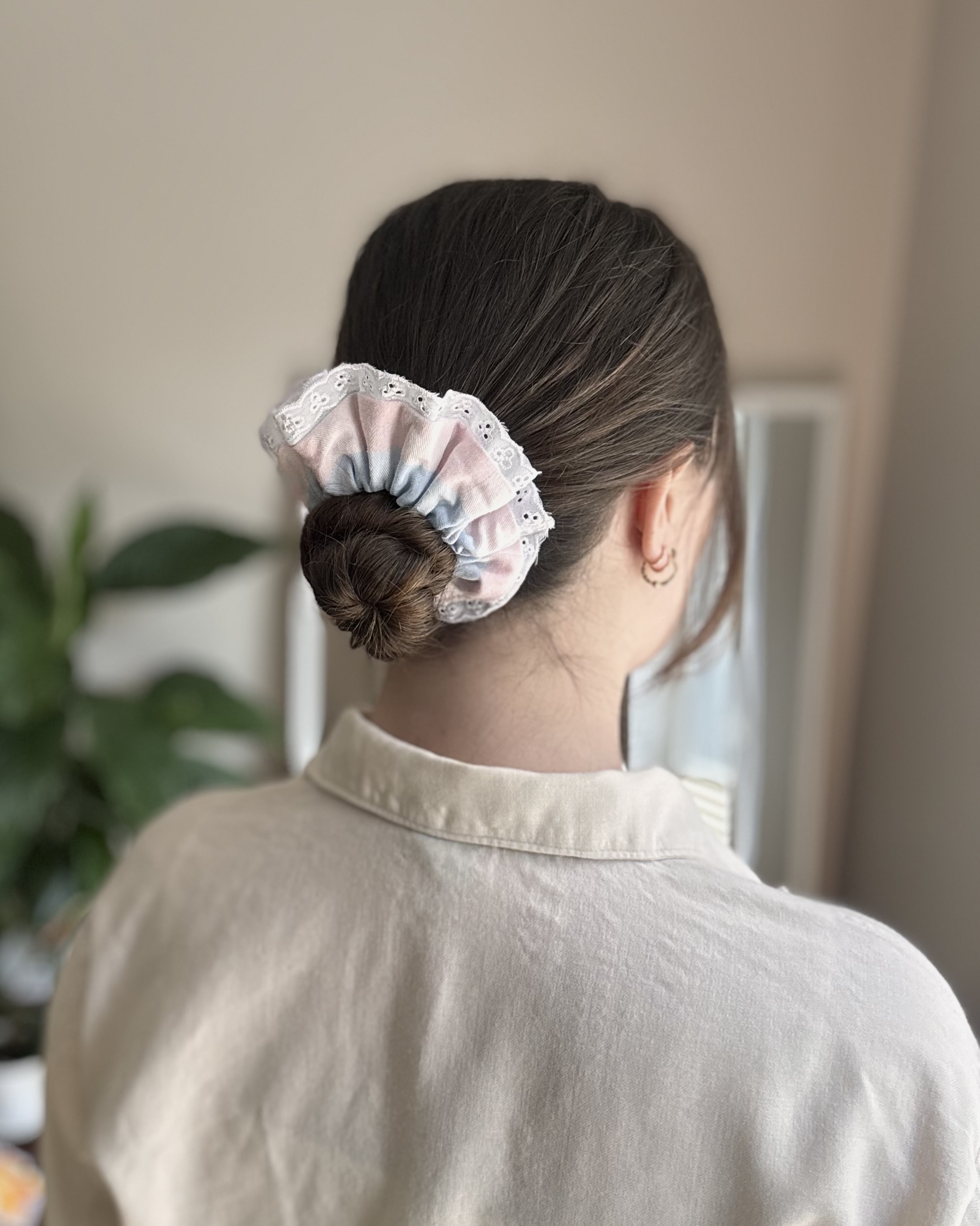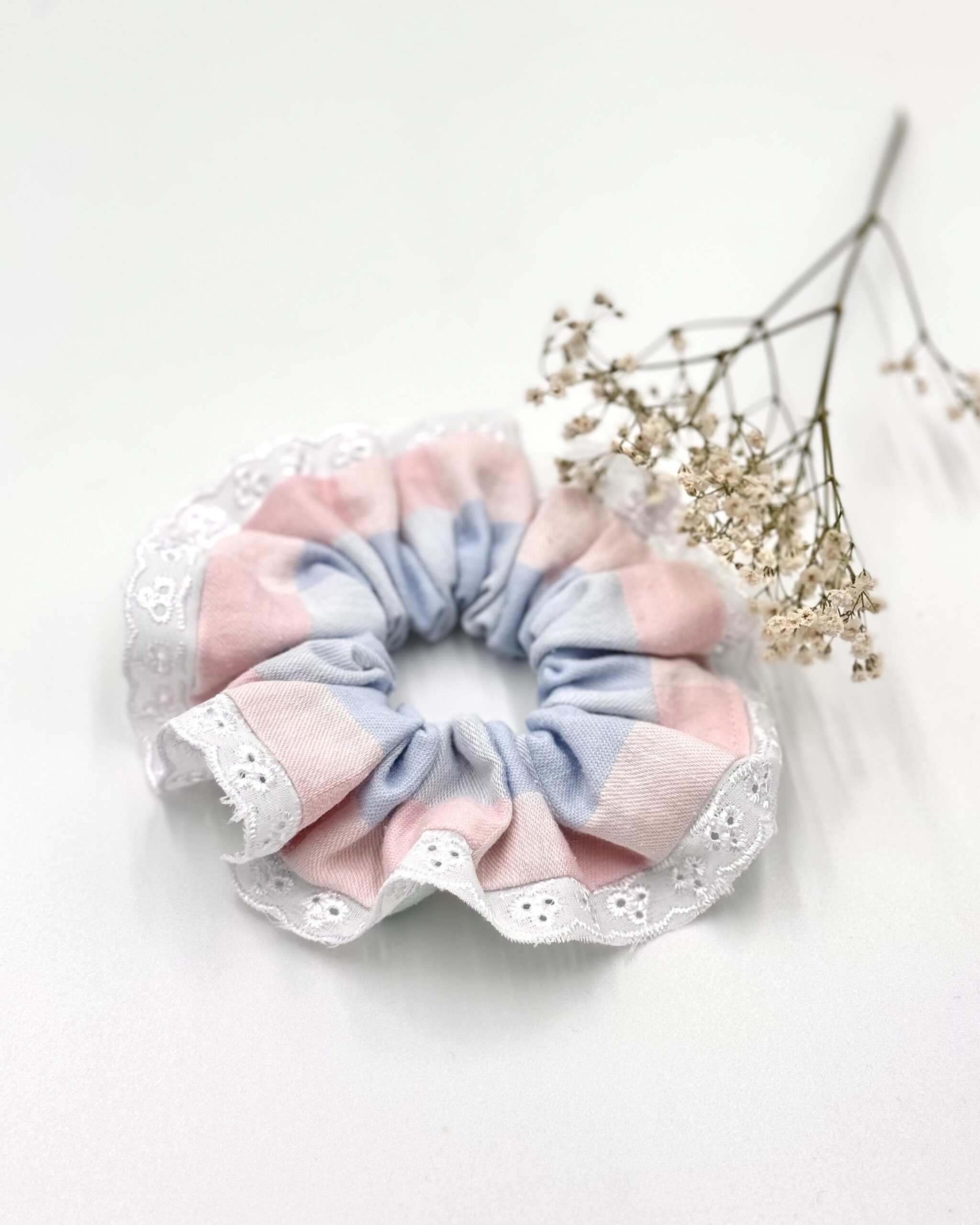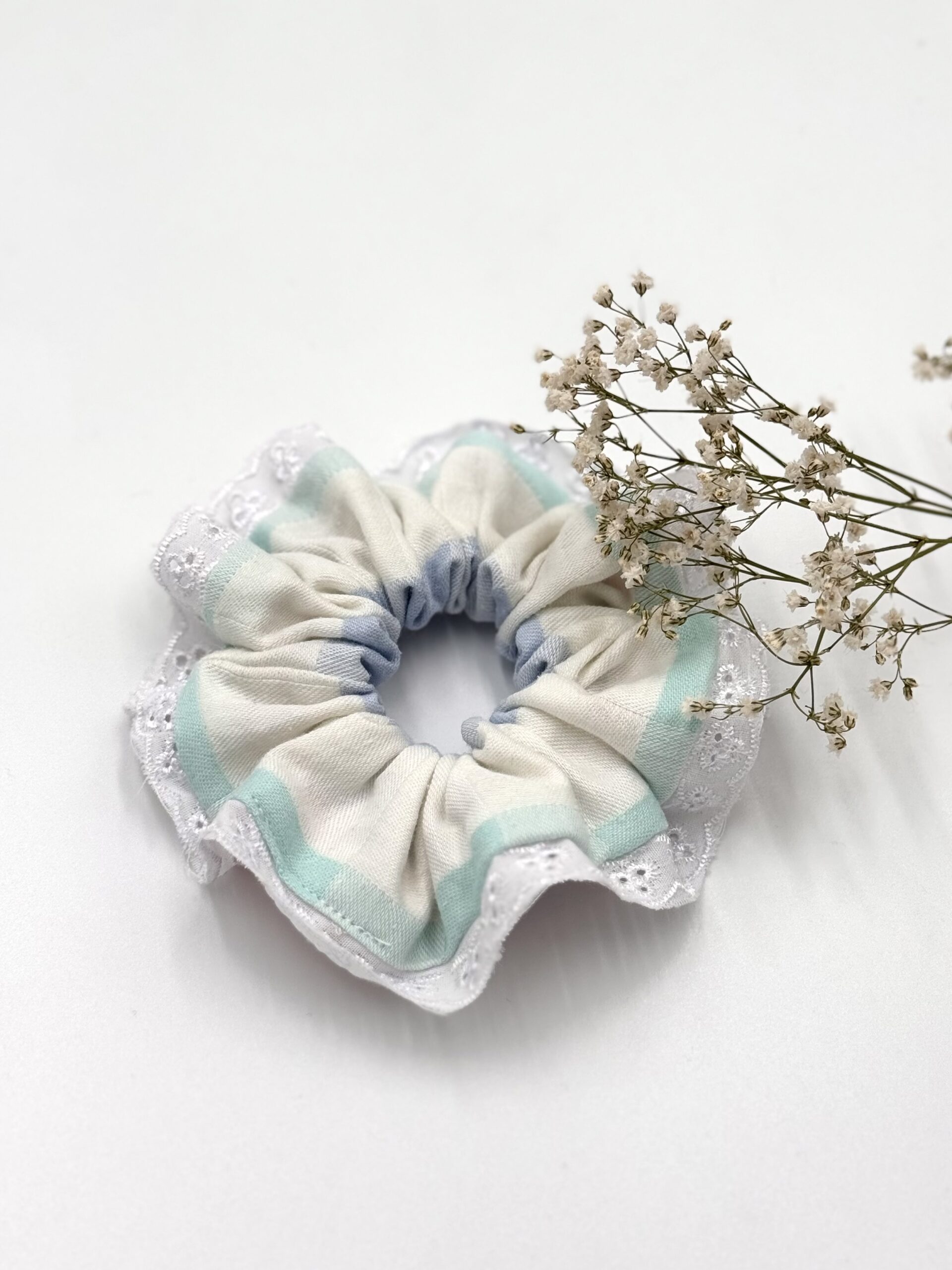 Ta wyjątkowa gumka do włosów zachwyca pastelowym wzorem i subtelnym brzegiem ozdobionym haftem angielskim. To doskonały wybór dla osób, które cenią sobie elegancję w codziennych stylizacjach.