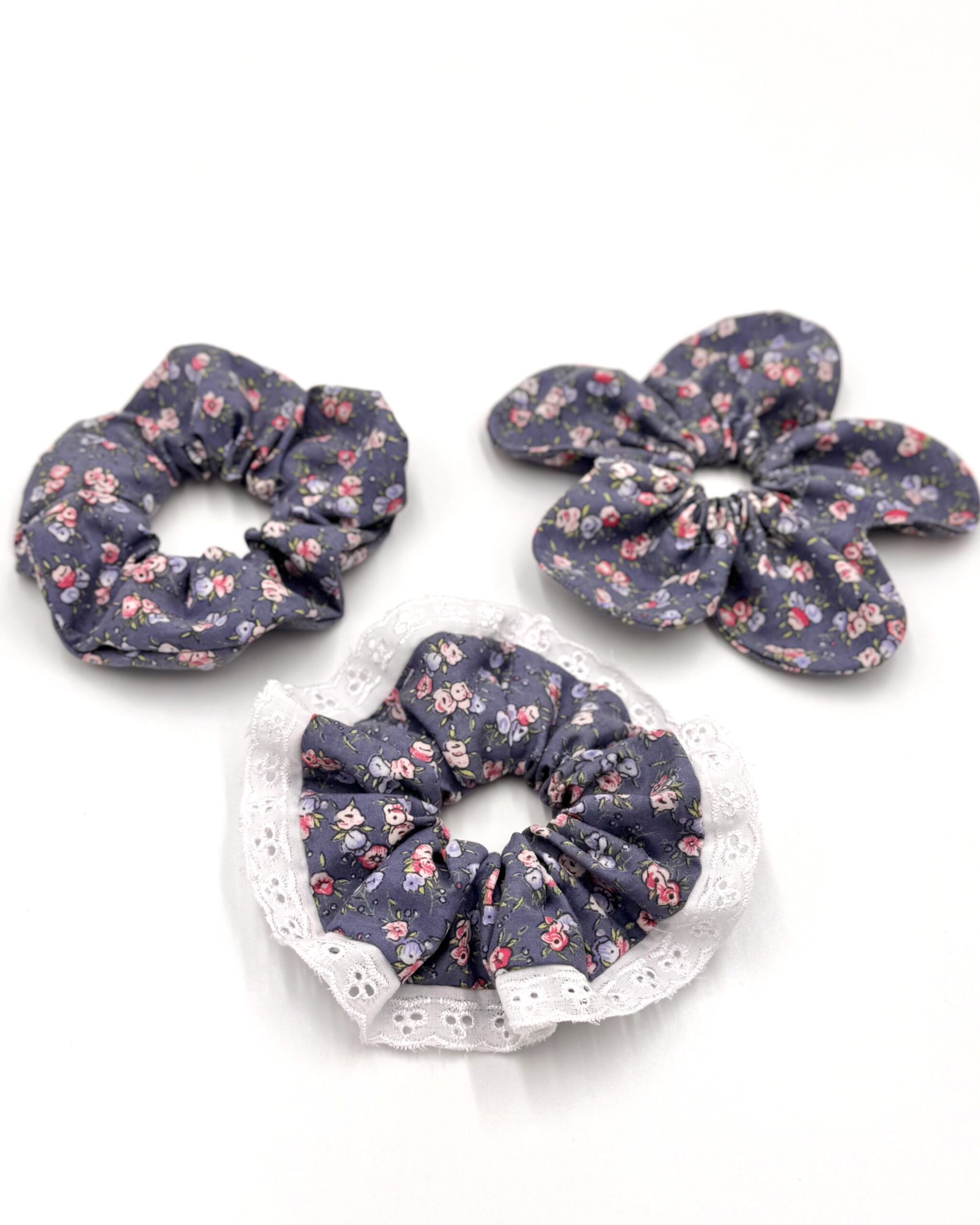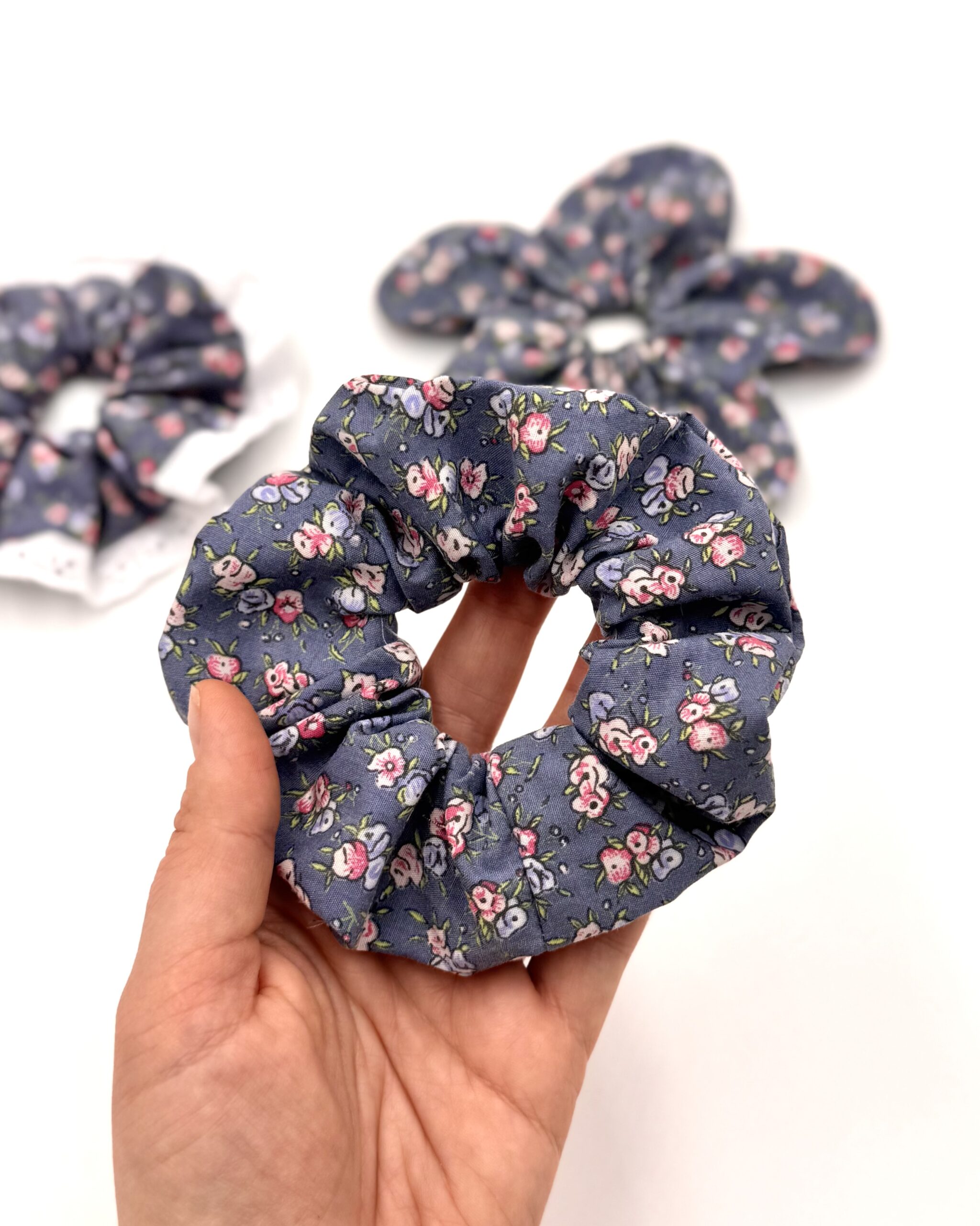 Scrunchie uszyta z bawełnianej tkaniny o kwiatowym wzorze.