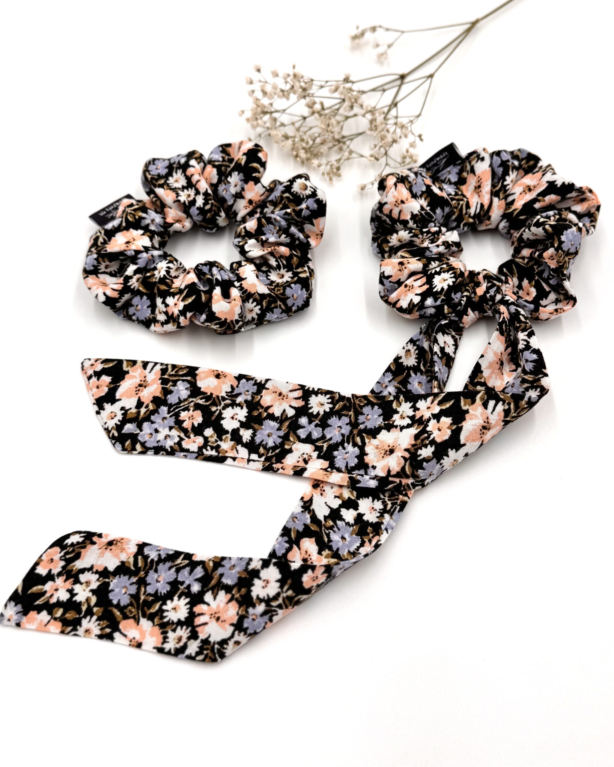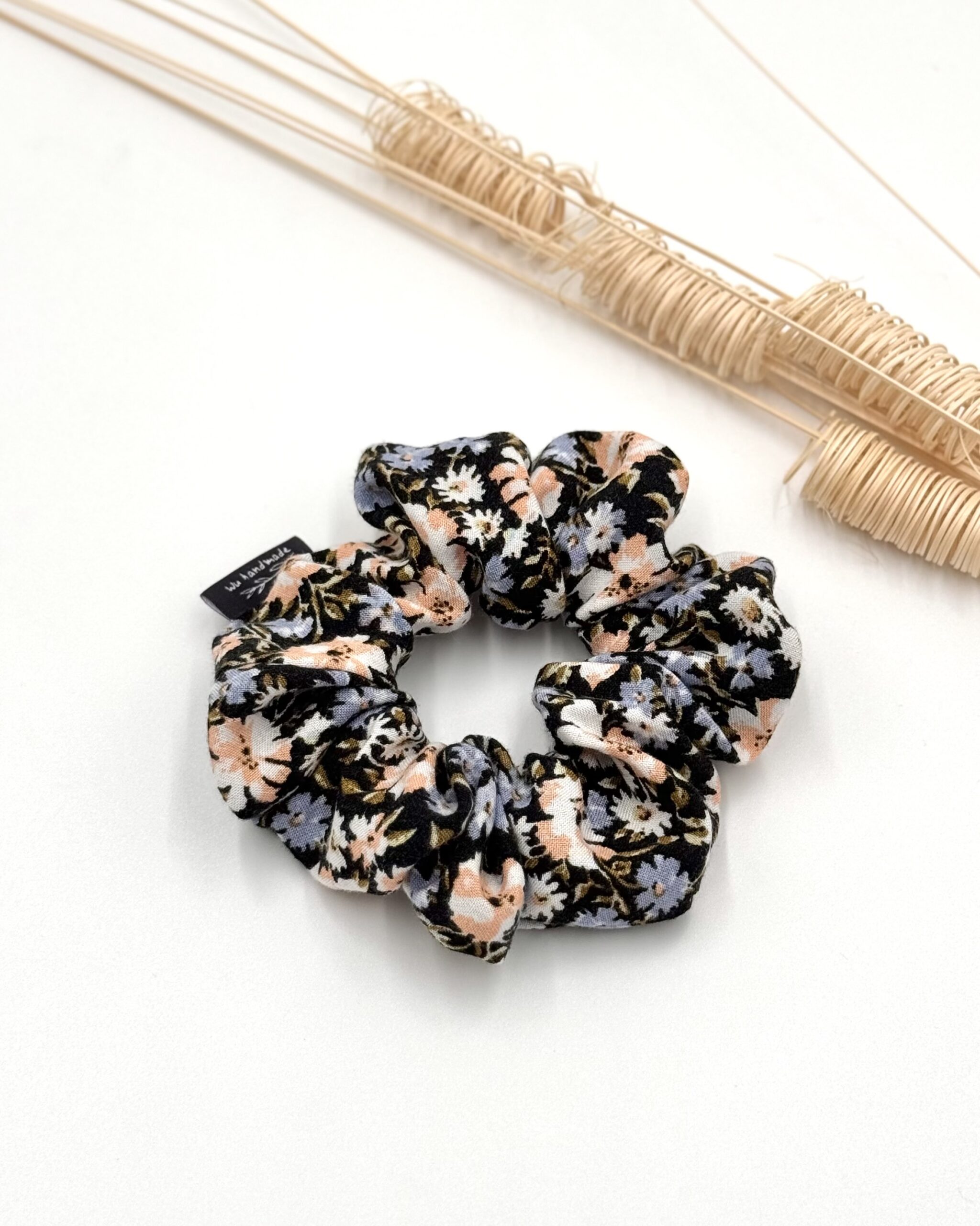 Scrunchie uszyta z wiskozowej tkaniny o kwiatowym wzorze.