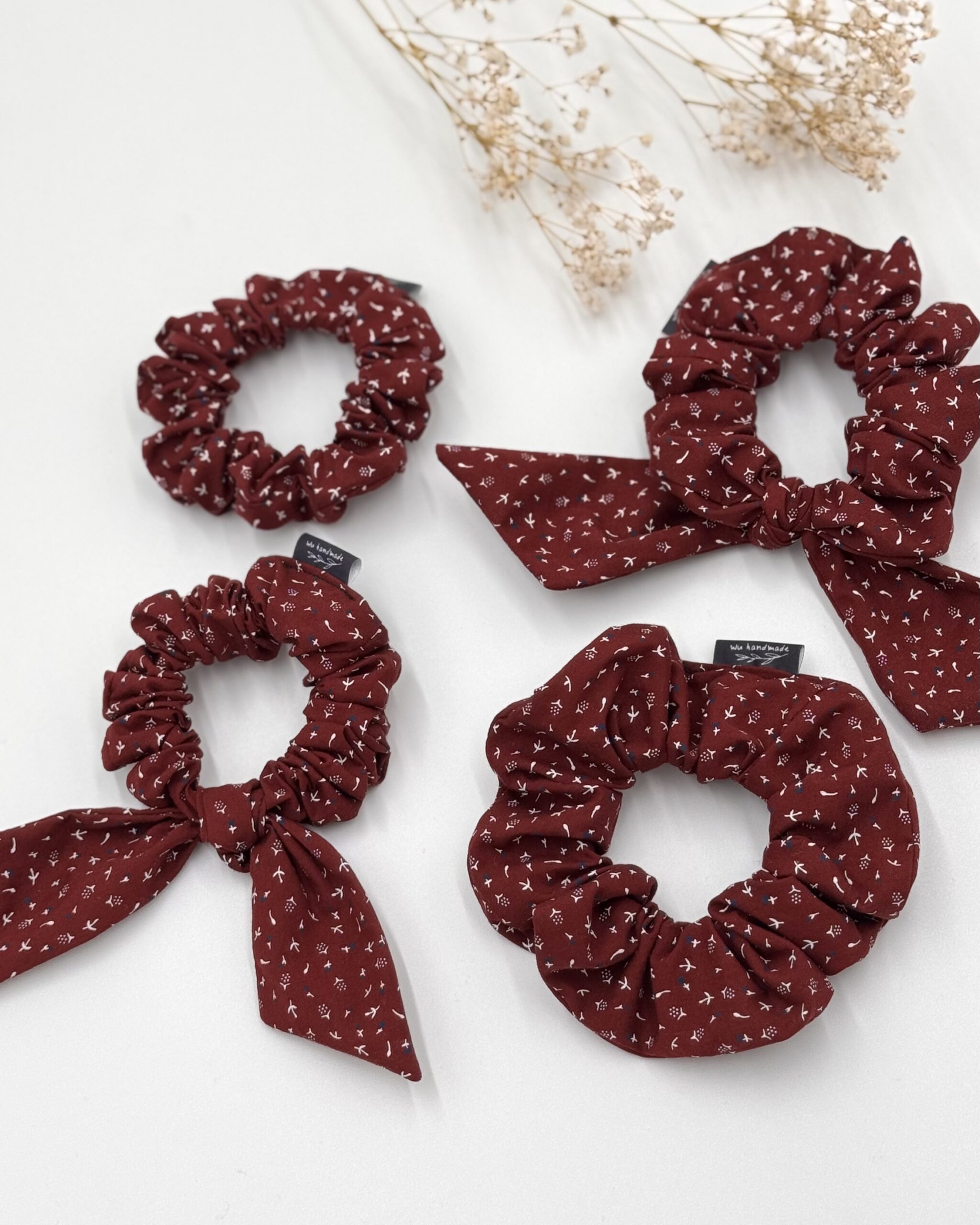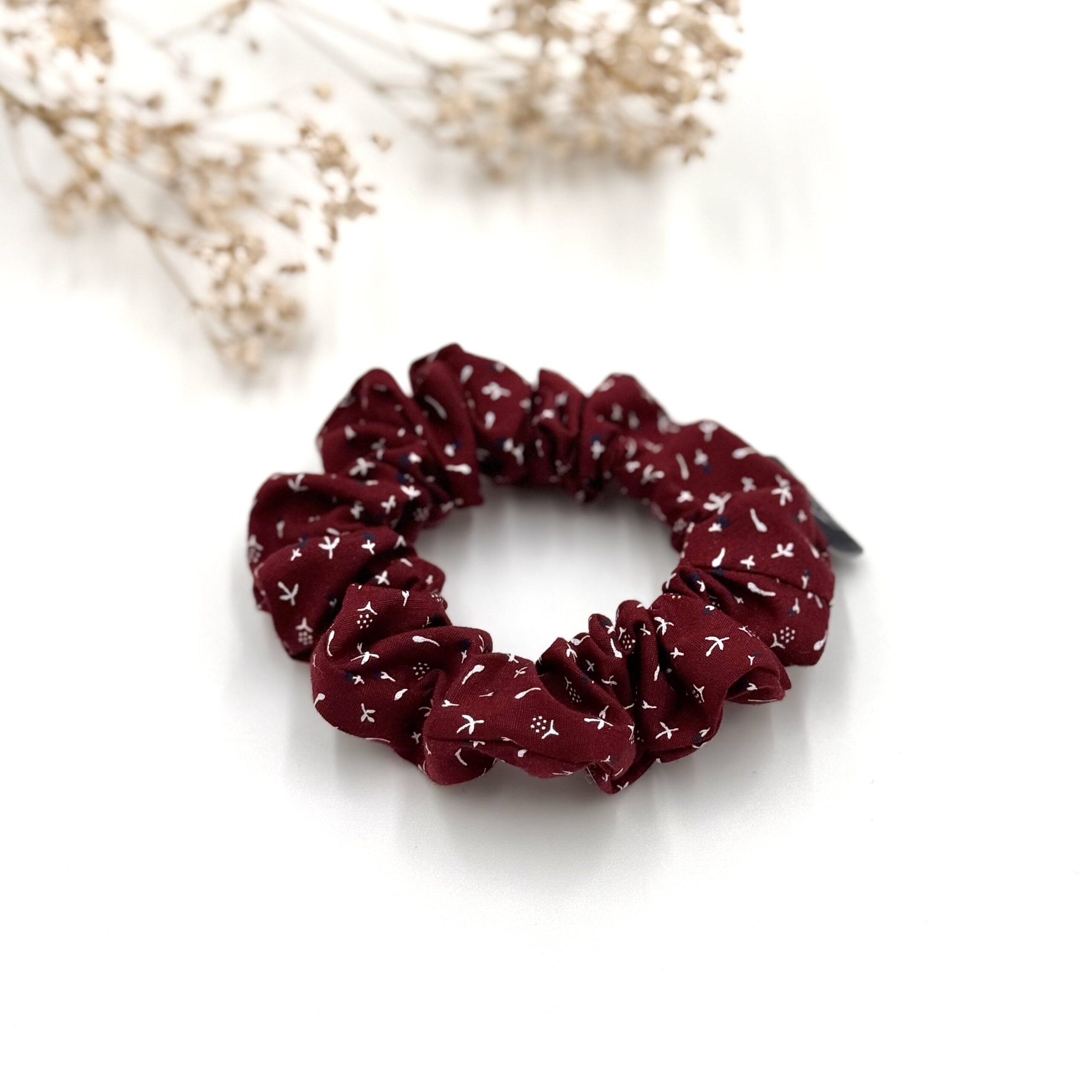 Uszyta z tkaniny w odcieniu bordo we wzorki. Lekka i wygodna, sprawdzi się nie tylko we włosach, ale także jako ozdoba na nadgarstku.