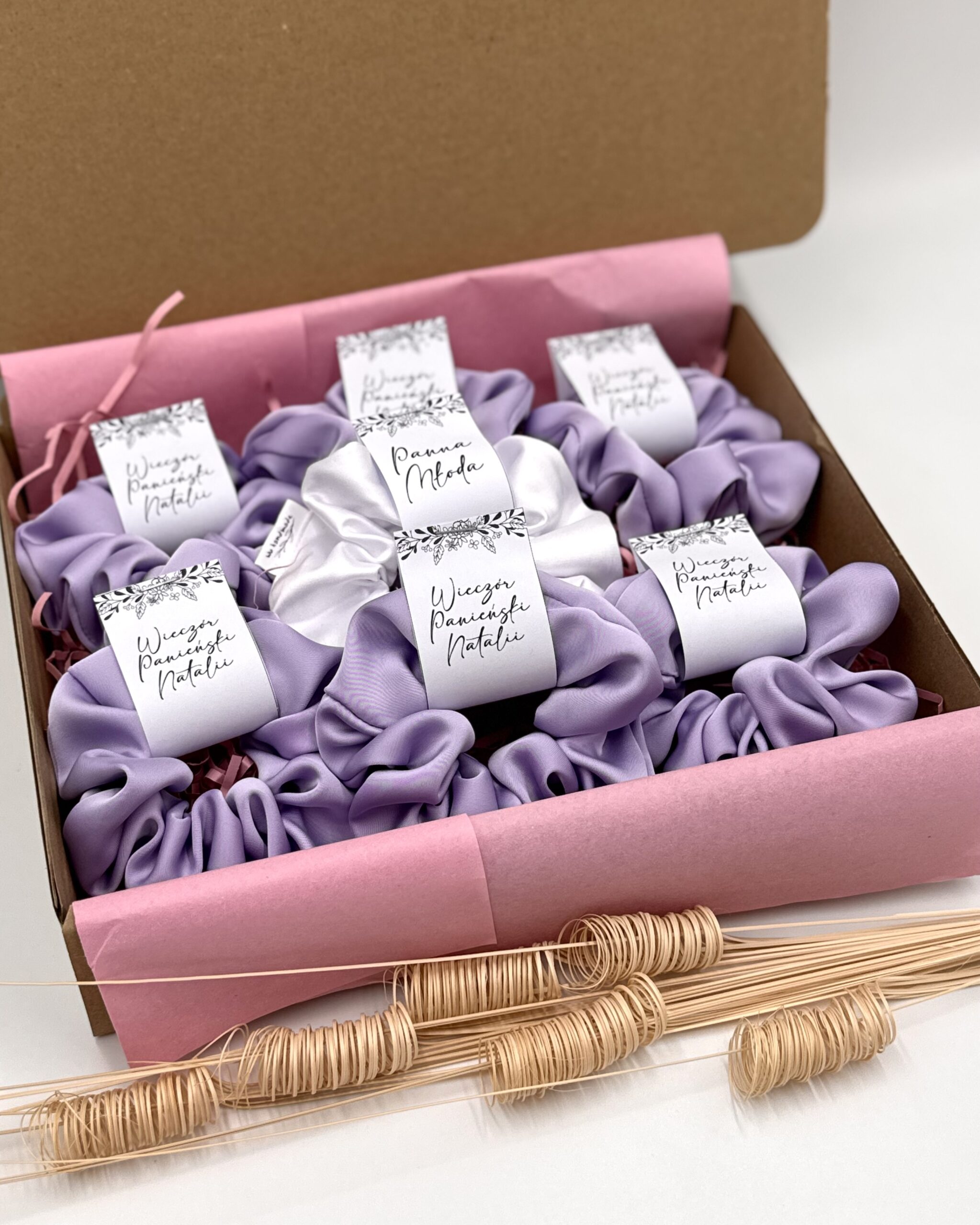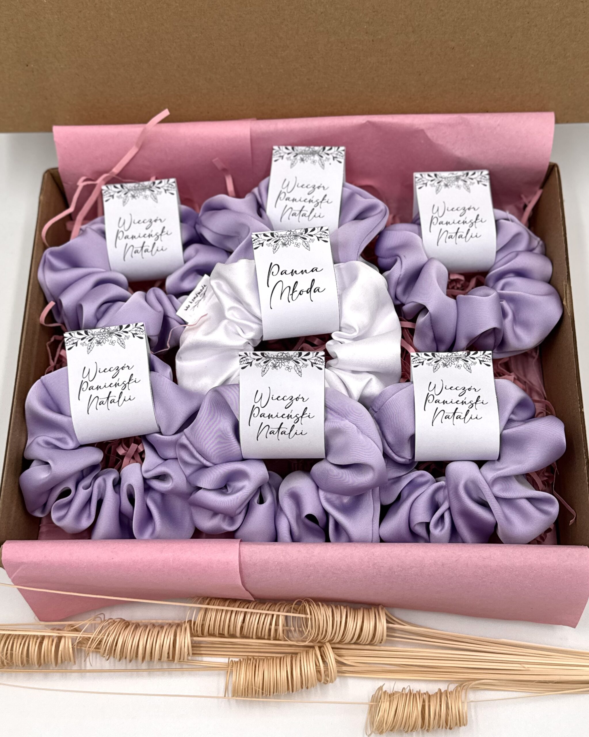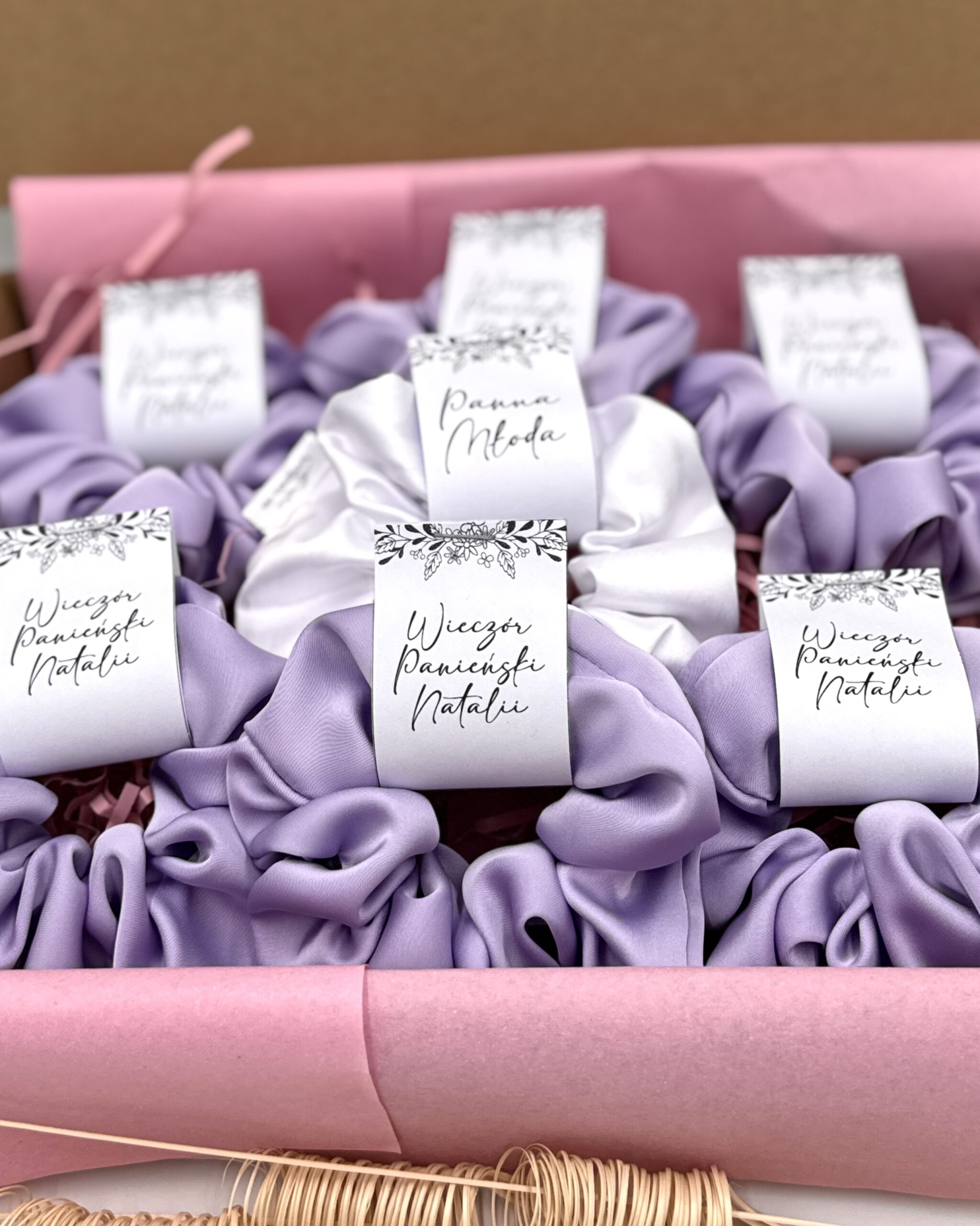 Oferta dotyczy jednej sztuki scrunchie uszytej z delikatnej satyny poliestrowej przypominającej jedwab w kolorze lawendowym. Papierowa metka z wybrana przez Ciebie personalizacją jest zawarta w cenie scrunchies.