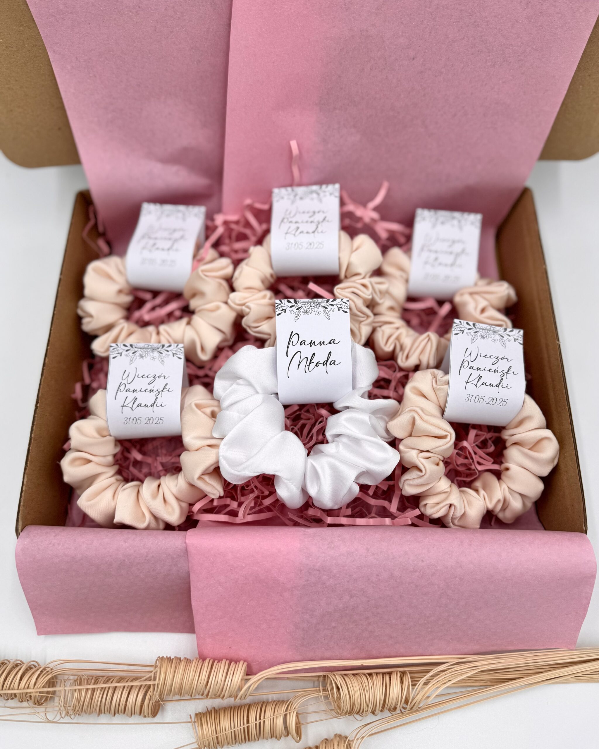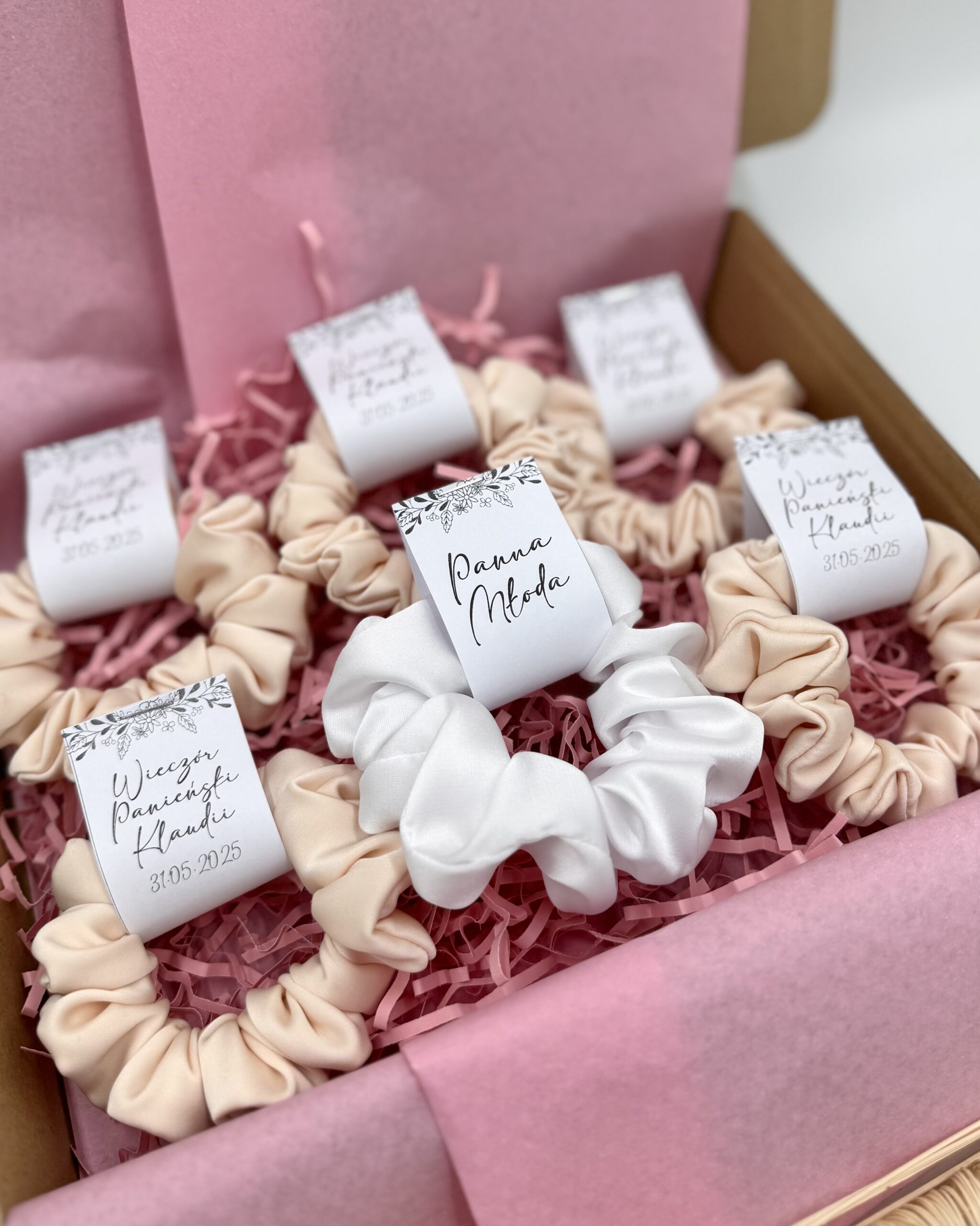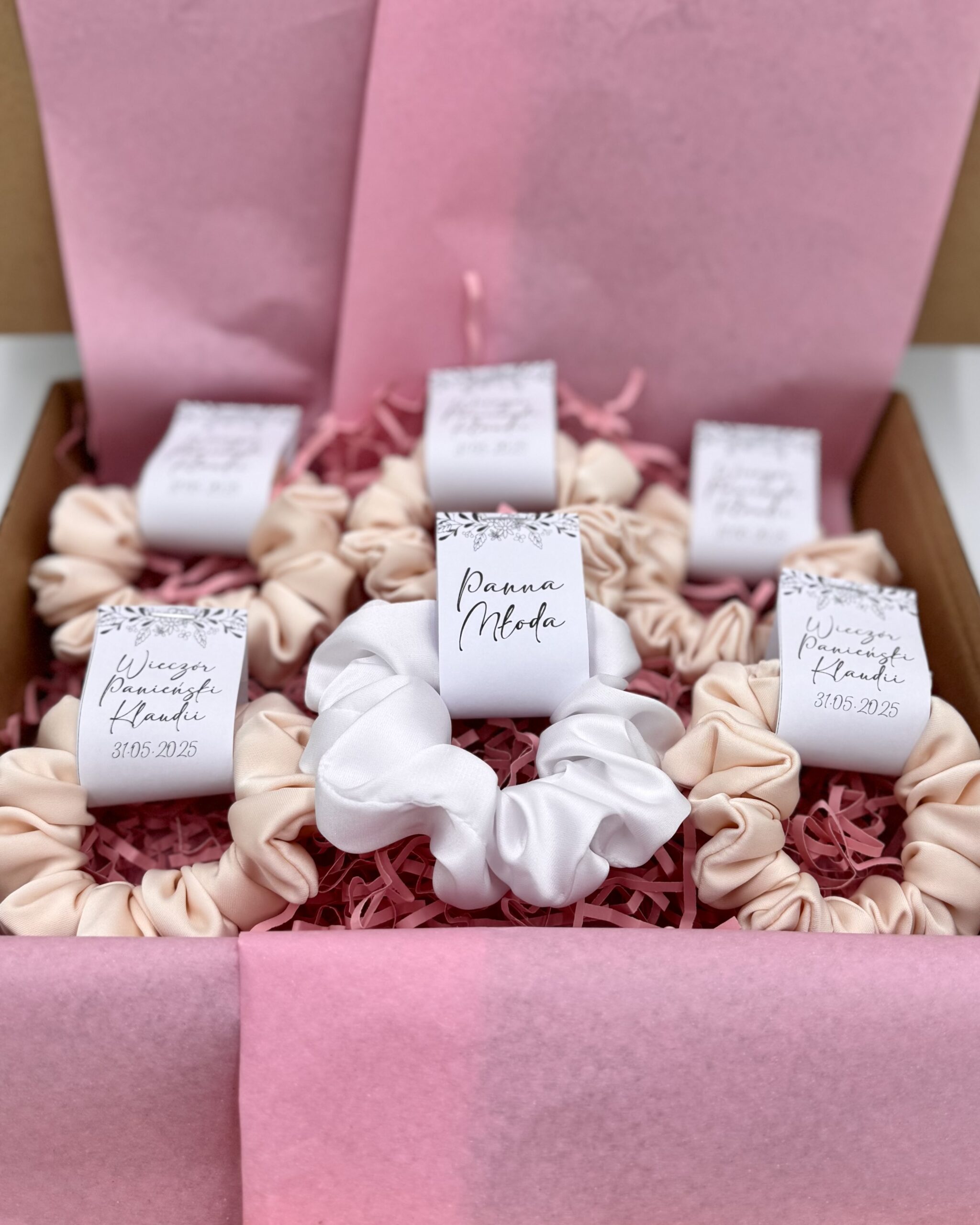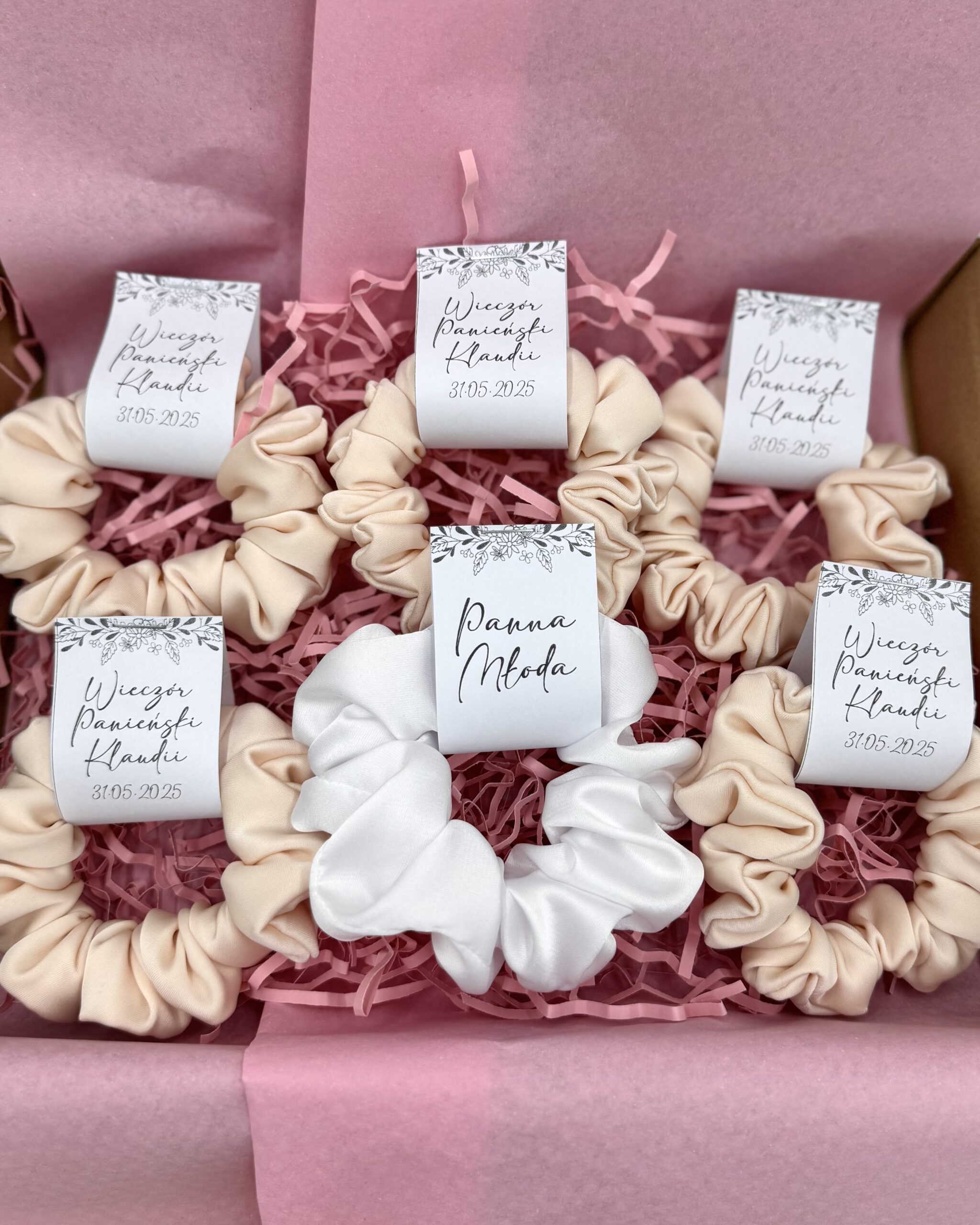 Scrunchies z wybraną personalizacją to wspaniały pomysł na upominki dla gości Wieczoru Panieńskiego, urodzin czy innej imprezy, podczas której chcesz wręczyć przybyłym mały prezencik.