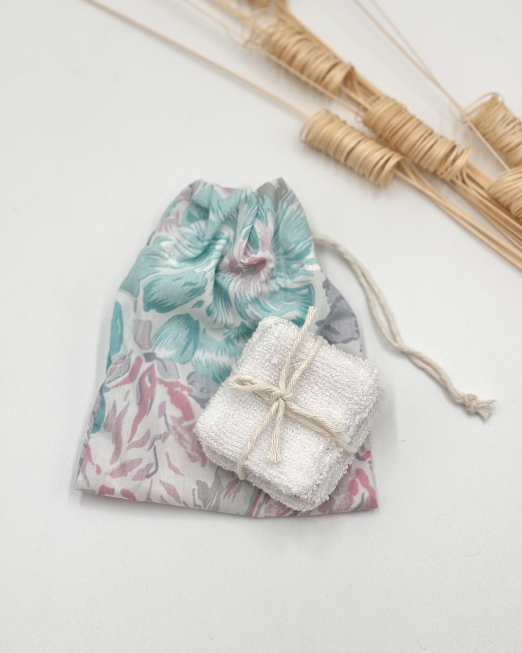 Płatki kosmetyczne wielorazowego użytku. Zestaw zawiera 4 płatki uszyte z froty bambusowej i tkaniny w kwiatuszki oraz woreczek.