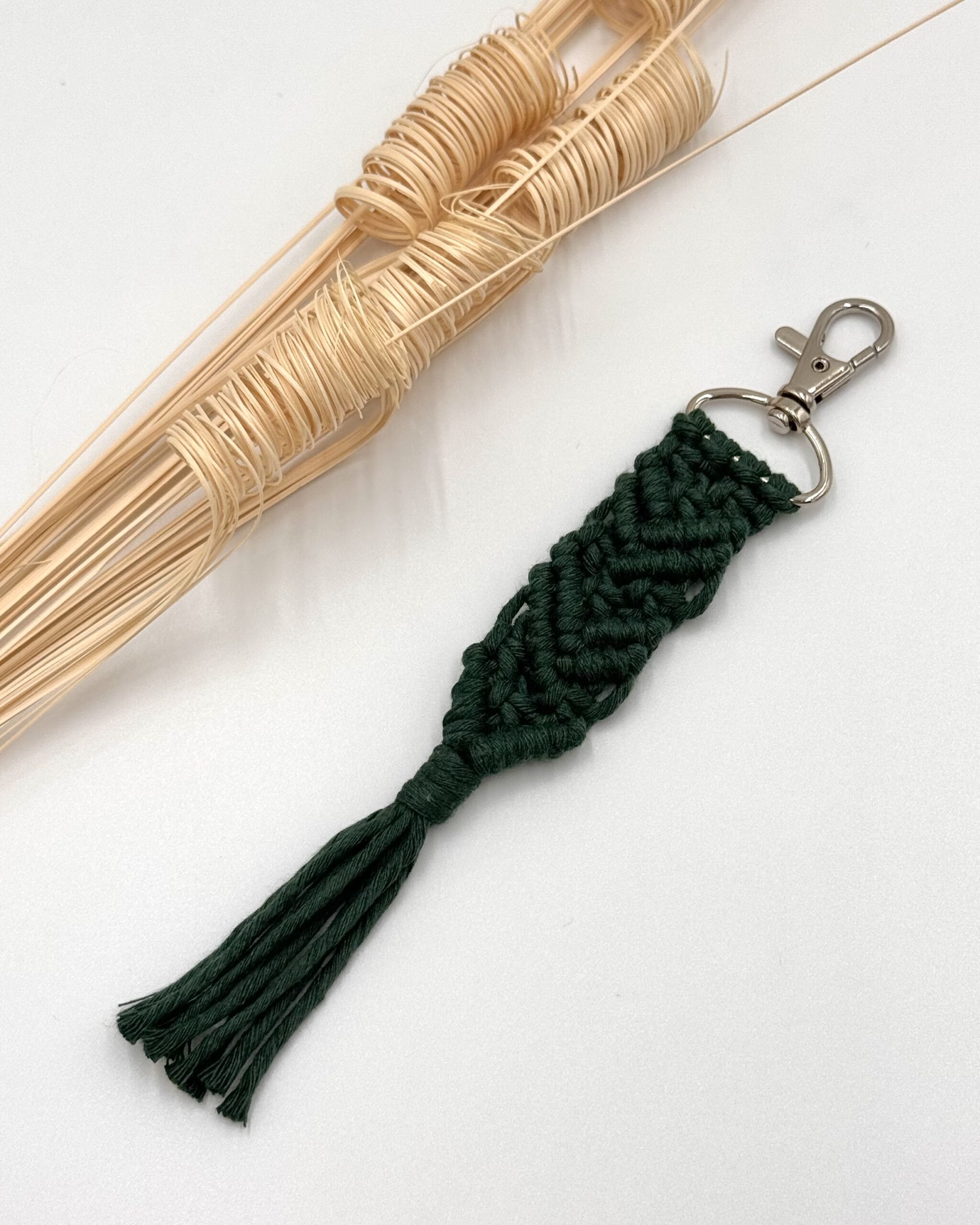 Zawieszka makramowa upleciona z bawełnianego sznurka w kolorze butelkowej zieleni.