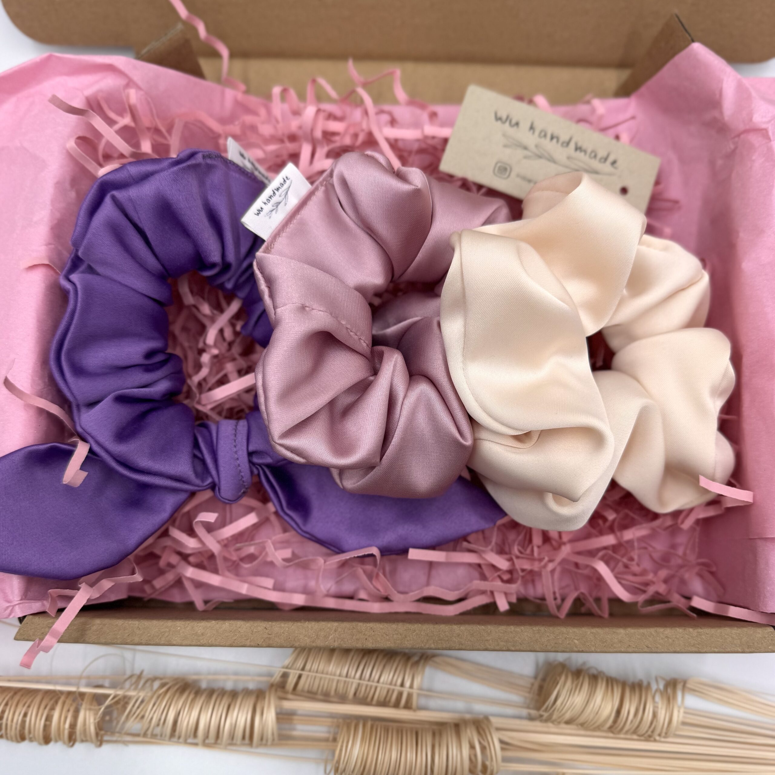– scrunchie z ogonkami uszyta z wysokiej jakości satyny bawełnianej w kolorze fioletowym, ogonki można odwiązać;